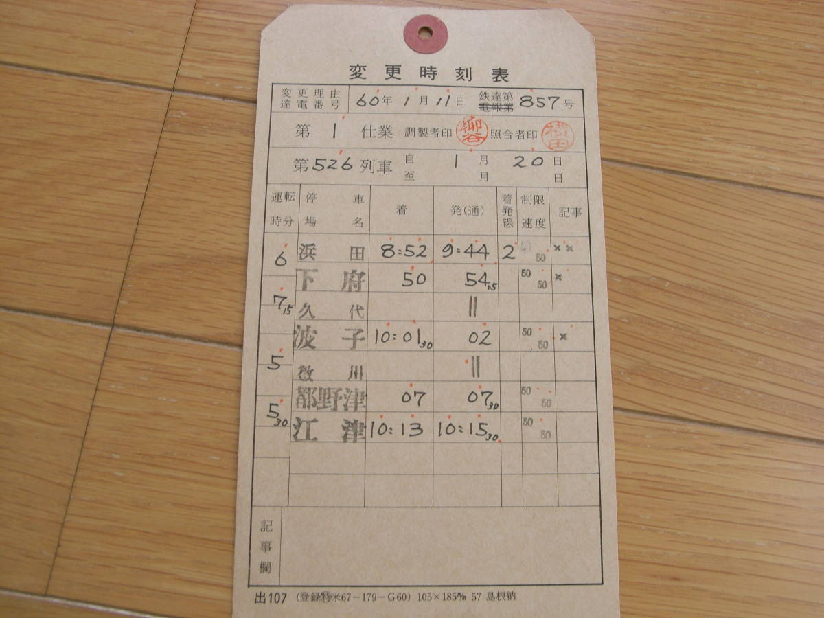 山陰本線 変更時刻表 変更理由達電番号昭和60年1月11日 鉄通第857号 第1仕業 第526列車 1月20日 浜田 江津
