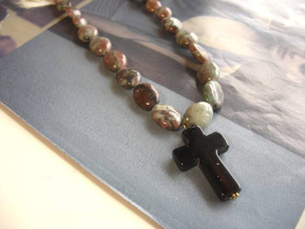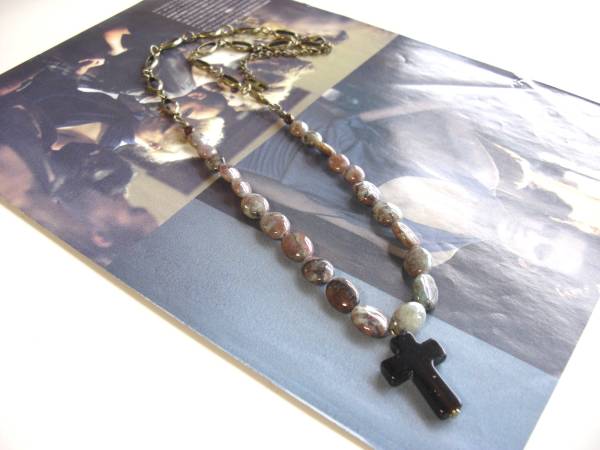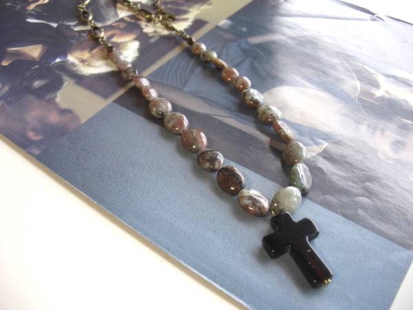 個性と自由・・シリーズです♪恋愛映画の余韻・・シックなグリーンガーネットのネックレスです♪♪オニキスのクロスやデザインチェーンを合わせてロマンチックな表情です♪グリーン ガーネットは10ミリから13ミリ位までのフラットオーバルです♪トップのオニキスのクロスは3×2センチ位です♪長さは全長68センチ位で調節自由です♪♪シンプ ルで飽きのこないいつまでも着けられるデザインを考えて作りました!お揃いのブレスレットやピアスも出品しています♪ハンドメイドをご理解頂いてノークレーム、 ノーリターンでお願いします