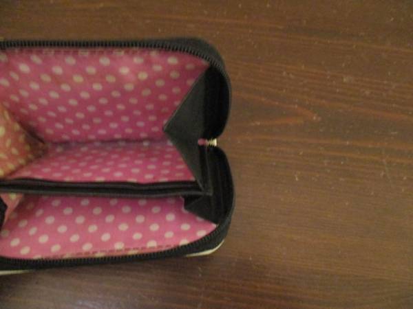 | 商品紹介 | 黒のビニール素材のベースに白のラインが可愛いです。 内側はピンク時に白のドット柄で、ポケットは2つに仕切られています。 |