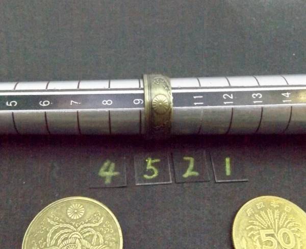 この商品は、昭和21年発行の 大型50銭黄銅貨を使用し、貨幣に穴を明け木槌で叩いてリングに成形した1点ものです。