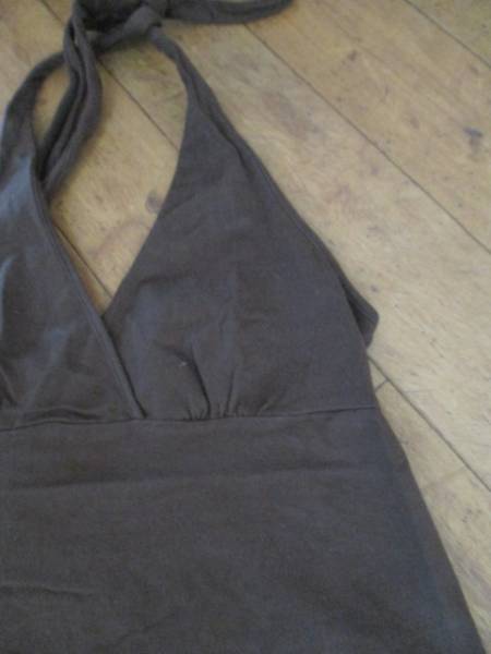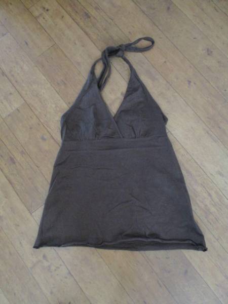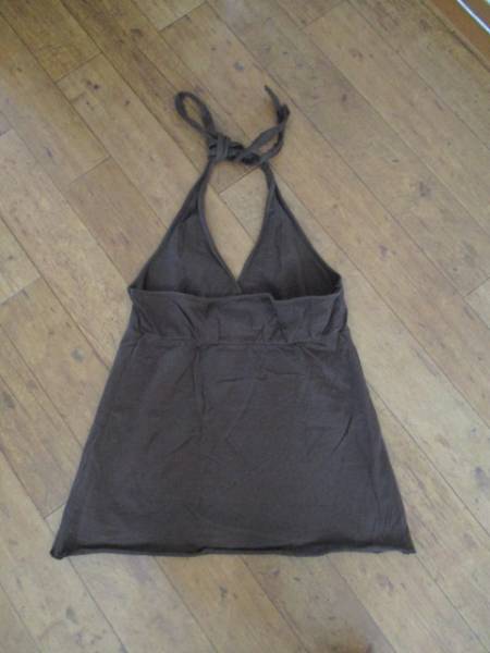 | 商品紹介 | こげ茶のホルターネックキャミソールです。 胸元は三角で中央が軽く重なっています。 胸下に切替えがあり、切替えから下はAラインで少しふんわりとしたデザインです。 裾はホツレ留めがしてあるだけで、くるんと丸くなる形です。 《素材》 コットン100% |