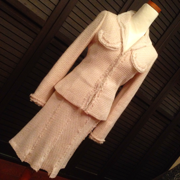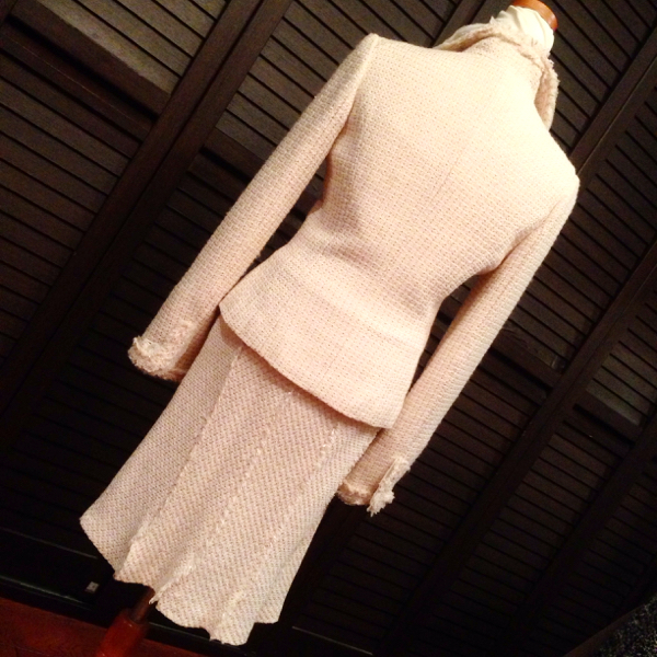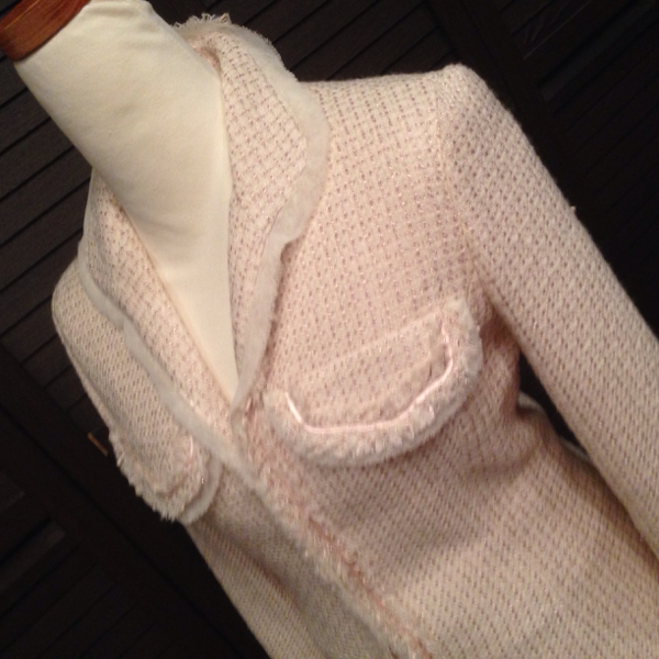 入学式で着るつもりでネットで購入しました。お着物にする事にしたので新品のままどなたかにお譲りします。サイズ38で9号です。実寸は平置きでジャケットは肩幅40脇下身幅45着丈57袖丈60、スカートはウエスト33ヒップあたり44、丈57です。素材はウール55ナイロン26レーヨン11ポリエステル7アクリル1です。お色が少しベージュのような生成りに光沢あるピンクの糸とゴールドの糸が織り込んであるツイード生地で襟元と袖口に同色の生成りベージュのオーガンジーがあしらってあります。品良くシンプルなデザインでラインが綺麗なスーツです。購入価格は30000円ほどでした。発送はクロネコ宅急便元払いのみです。