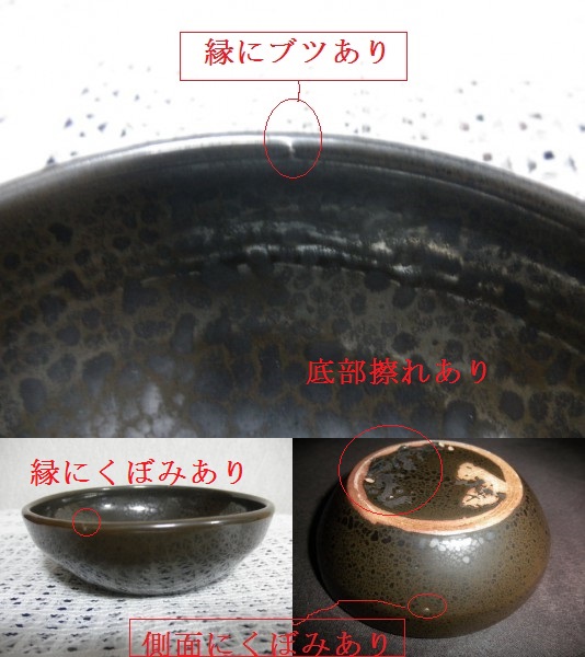 油滴天目風の小さな器です。 画像表示のように縁と側面にくぼみあります。また縁にブツ1点あります。 底部に釉薬擦れあります。 銘がございますが、作者不明です。 以上ご理解されてのご入札をお願いいたします。 サイズ 口径10.9cm 送料 補償なし定形外円可です。 お願い 神経質なお方・些細な事が気になるお方、 または、新品をお求めのお方は、ご入札をお控えください。 ♪出品時、十分確認はいたしておりますが、稀にキズなど見落し がある場合がございます。中古品をご理解の上、ノークレームノーリターンでお願いいたします。 ♪お客様のPC環境で、実物の商品の色と多少の誤差が生じる場合がございます。それらの点を十分ご理解いただいた上でご入札頂きますようお願い申し上げます。 ♪お客様の思い描くイメージが違うと言った返品はご勘弁ください。 ♪システム手数料・消費税、梱包代金等、一切頂戴致しておりませんので、ご安心して御落札下さい。 ♪発送は基本的に、ゆうパックでの発送になります。 ♪お安い送料を、ご希望される場合、補償はございませんが定形外可です。 ♪定形外郵便円(破損、不着の補償無し、追跡無しです。) ご理解ください。 ♪ゆうパック 60サイズ(持込割引120円引)となります。 ♪梱包材は原則的段ボールなど再生のものを利用しております。 プチプチで包んでしっかり丁寧梱包を心がけていますのでご安心ください。 ♪商品の説明及び注意事項に(同意されての上で)ご入札をお願い致します | |||