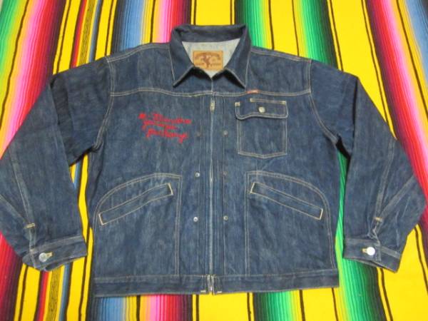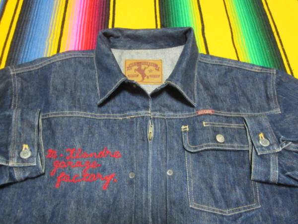 1940年代の リーバイス ファーストモデルを意識したディテール、フロントトップスナップボタン、ジッパー開閉、フラップ付き チェストシングルポケット、フロントプリーツのリベット補強、「M. FLANDRE GARAGE FACTORY」 クラシックレター刺繍、襟の カウボーイ ロデオデザインのオリジナルパッチ、ウェスト シンチベルトアジャスター 等等等...細部まで拘り抜いて作られているビンテージデニムジャケット