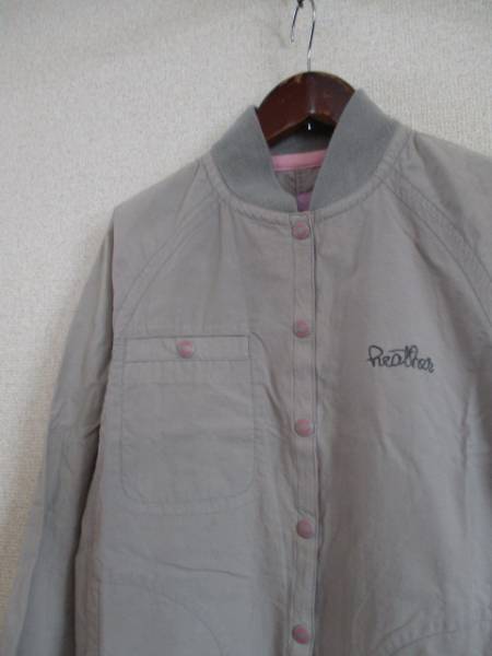 商品紹介 | スタジャン風デザインのブルゾンです。 色はグレーがかった薄いカーキで、ボタンのピンクの文字がアクセントになっています。 《素材》 綿70% ナイロン30% |