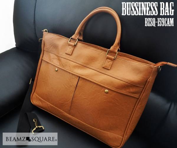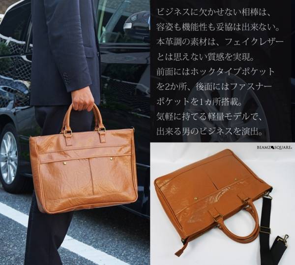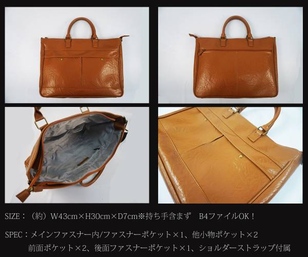 | B4ファイル収納可能!大容量本革調PVCバッグ 本革調に仕上げた、PVCビジネスバッグです。 質感やシワ感は、フェイクレザーとは思えない仕上がり。 ポケットも多数搭載しているので、ビジネスマンは必見です。 また、内径を広く確保したデザインなので、 B4ファイルも収納OK! ショルダーストラップも付属しているので、 肩掛けでも使える優れもの! [サイズ・容量] 【サイズ】:(約)W43cm×H10cm×D7cm [規格] 【仕様】:メインファスナー内/ファスナーポケット×1、他小物ポケット×2 前面ホックポケット×2、後面ファスナーポケット×1 ショルダーストラップ付属 【素材】:PVCフェイクレザー、内側/ナイロン | |