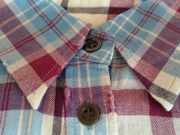 写真2枚目の様に襟、ボタン周りに糸がほつれている部分がありますが、この様にほつれている部分が全体的に結構な数あります。