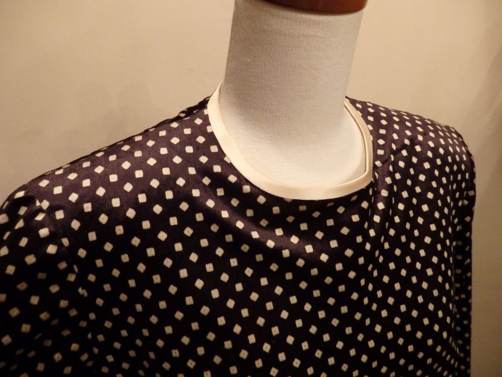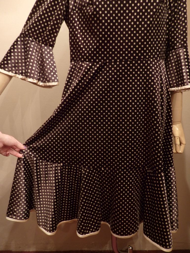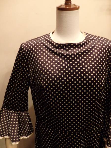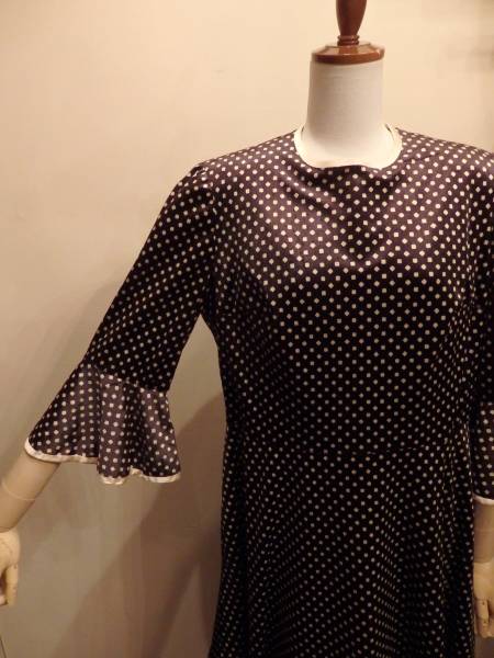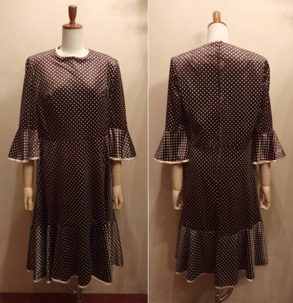 詰まった丸首、パット入りの肩、ベル状に広がる袖口や裾が時代感を感じます