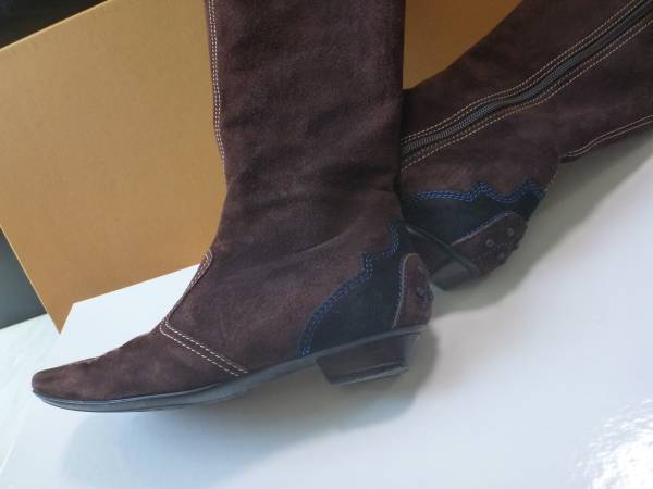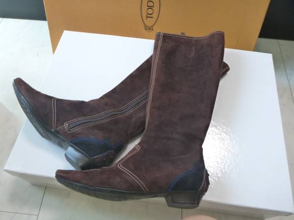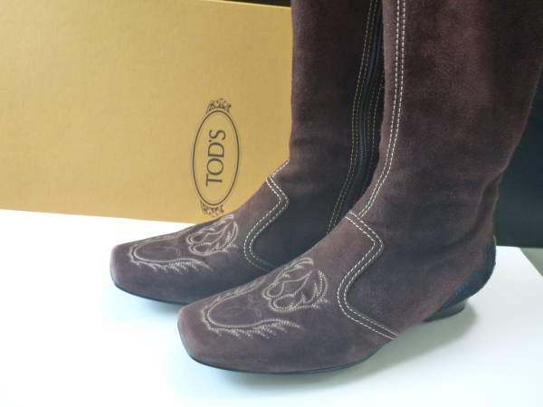 10万トッズ TOD'S茶ブラウンスウェードローヒールブーツ