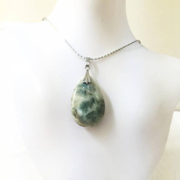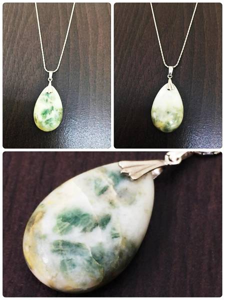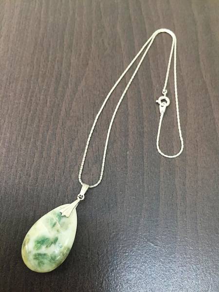 翡翠のような雰囲気のペンダントが付いています。 白色の中に海苔のような緑色が混在しています。触り心地はスベスベして気持ちが良いです。
