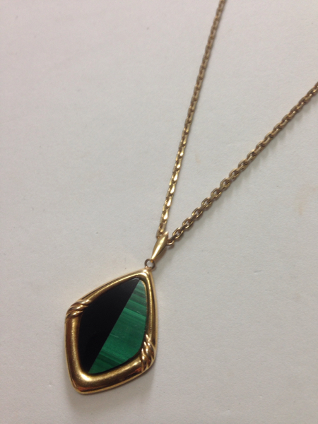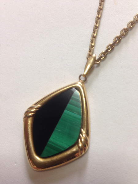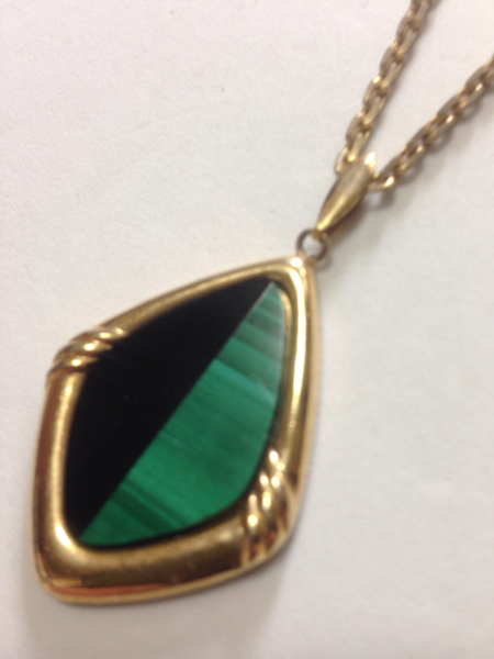 マラカイト、オニキスのモダンなペンダントネックレスです、グリーンとブラックのコントラストが素敵なペンダントネックレスです、 トップのサイズは35×25ミリ、長さは61センチ、(Gシルバー刻印) ★送料は120です