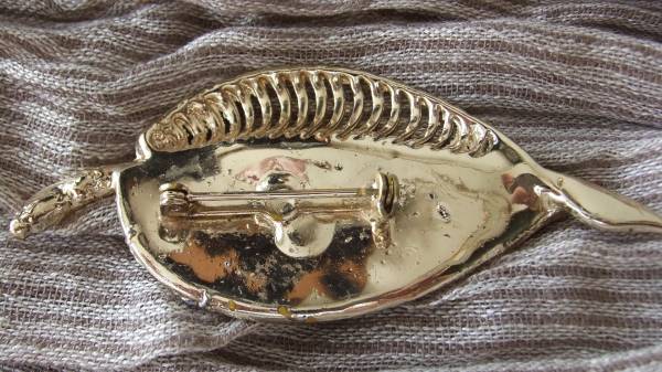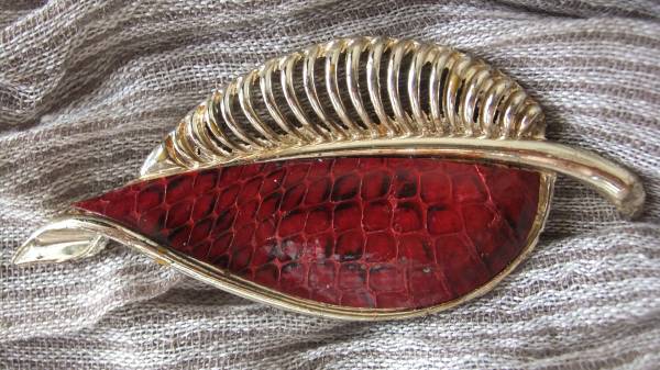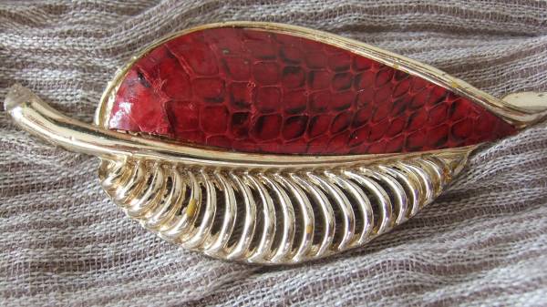 ヴィンテージ品淡いゴールドカラーと皮のような赤い色の葉っぱモチーフのブローチ。