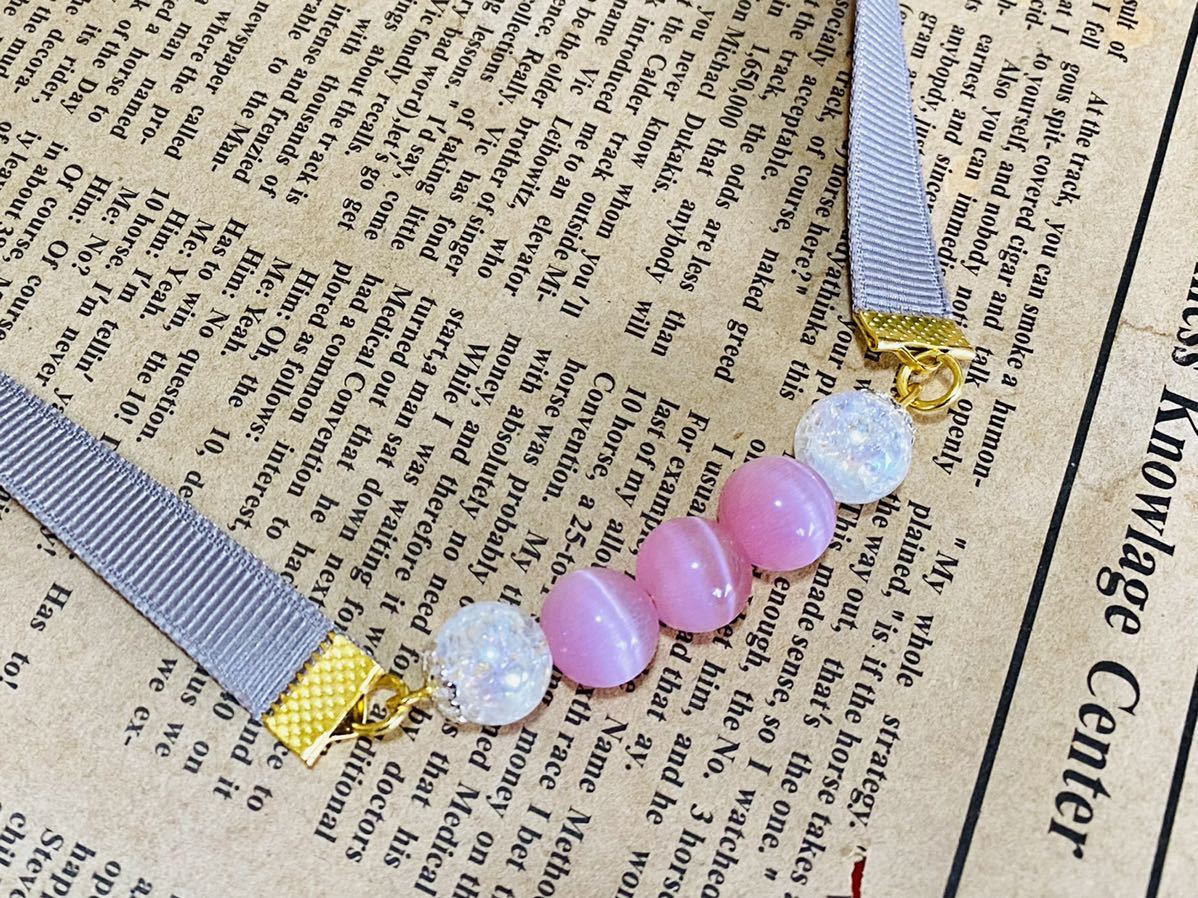 ◇美麗◇天然石 グログランリボンネックレス◇ピンクキャッツアイ×オーロラクラック水晶◇レディース◇パワーストーン◇