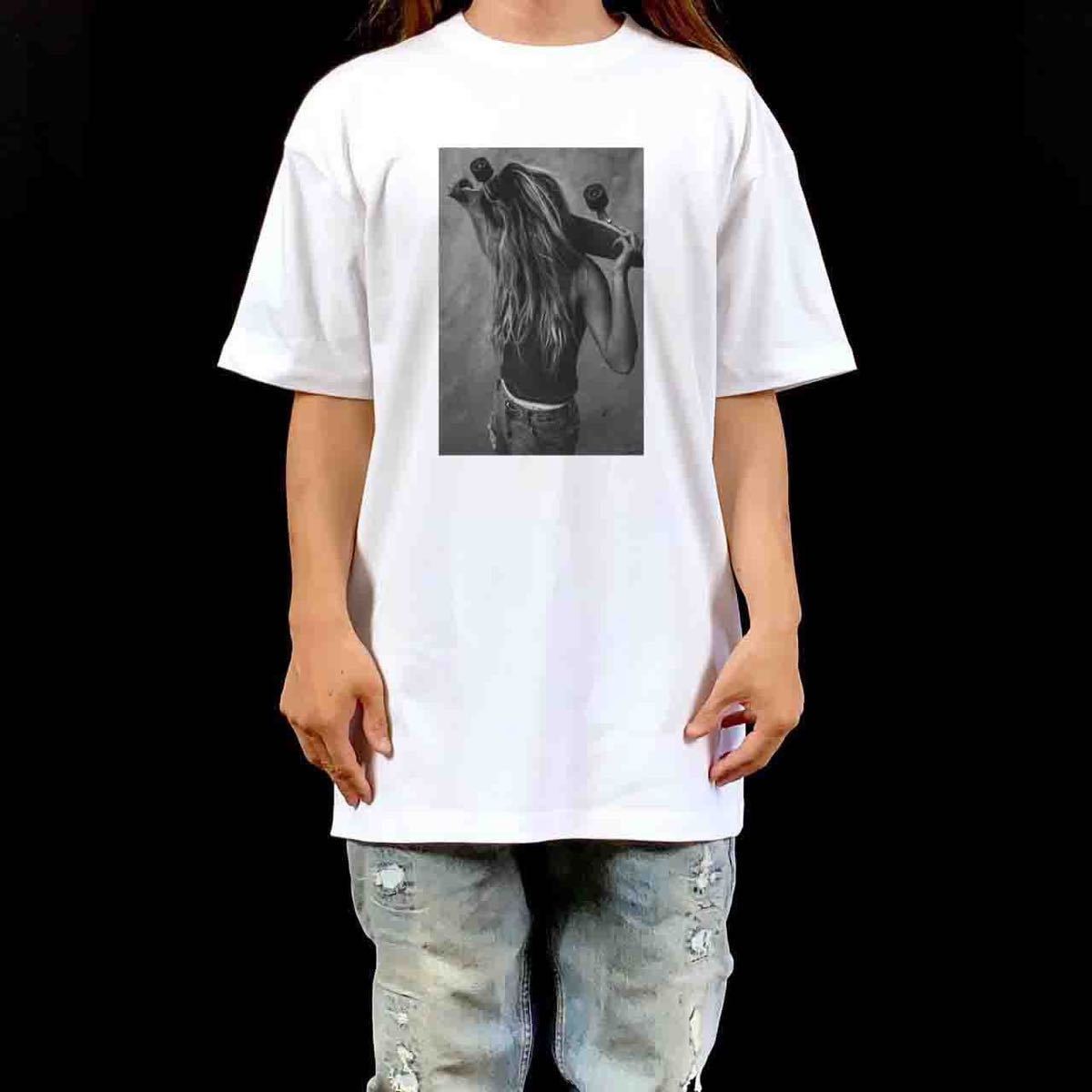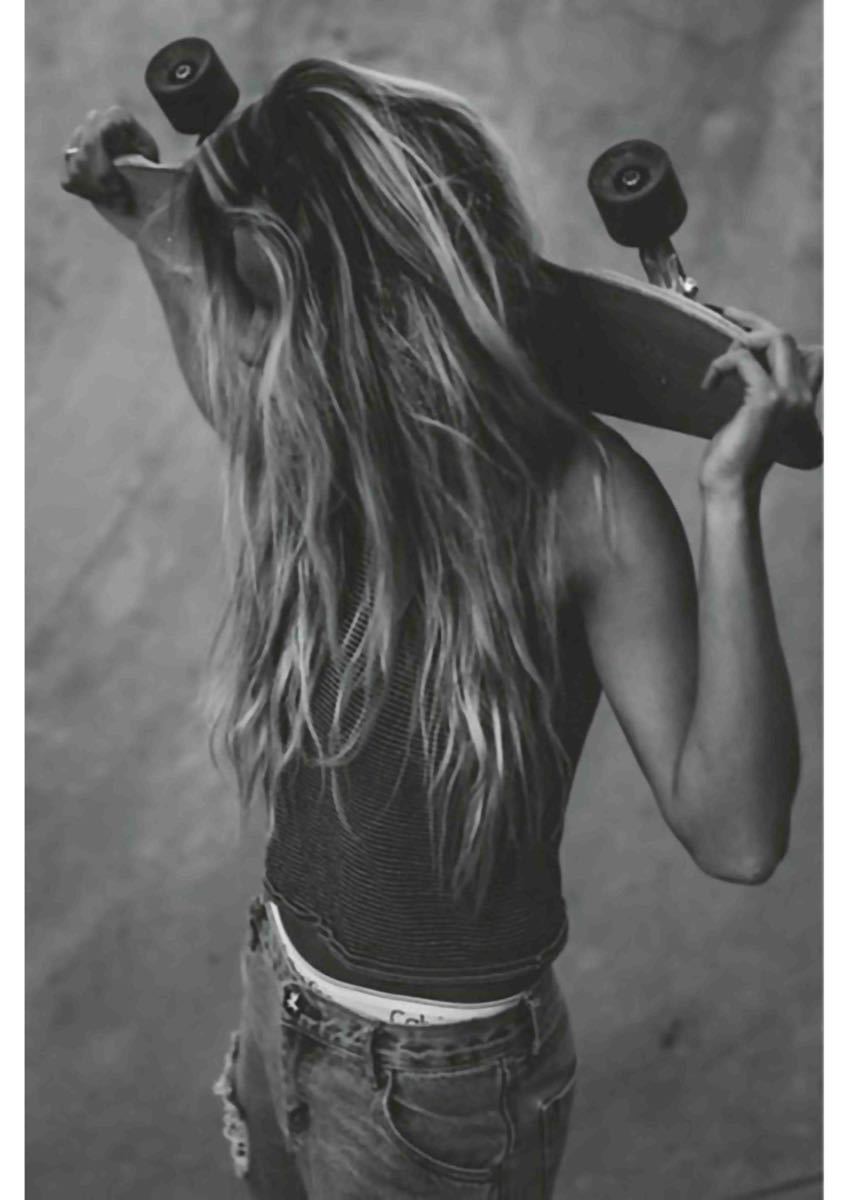 スケボーを持つスケーターガールのおしゃれでクールなモノクロフォトストリートデザイン。