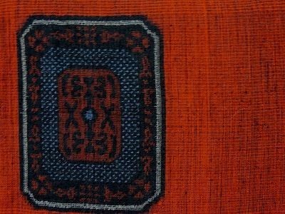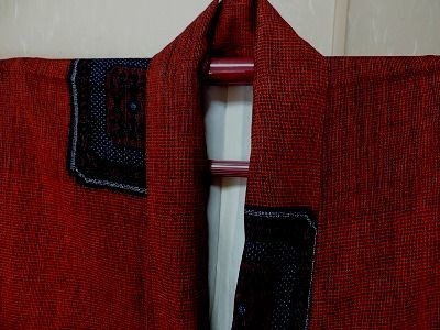袷小紋 広衿深紅色・黒 化繊 身丈149cm 裄65cm 中古 k50★喜香★