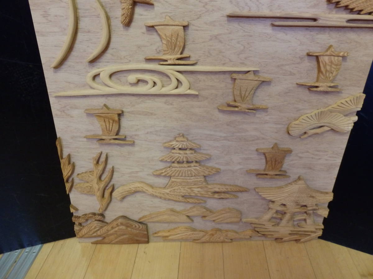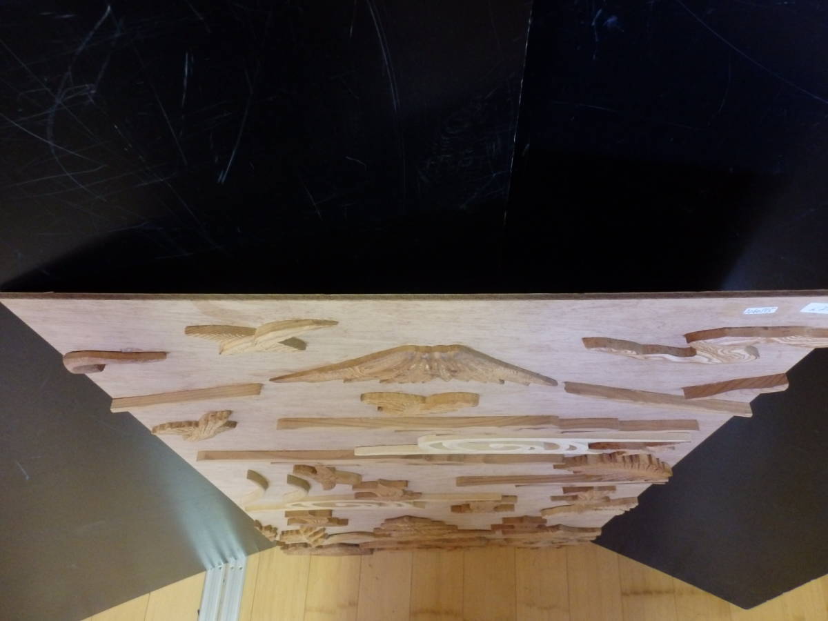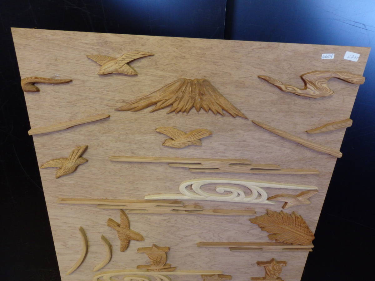 k1060915 彫刻◆木工◆ベニヤ板にさまざまな彫刻がはりつけられてあります