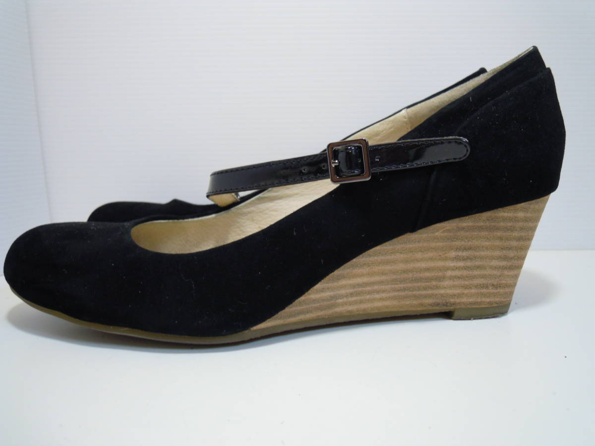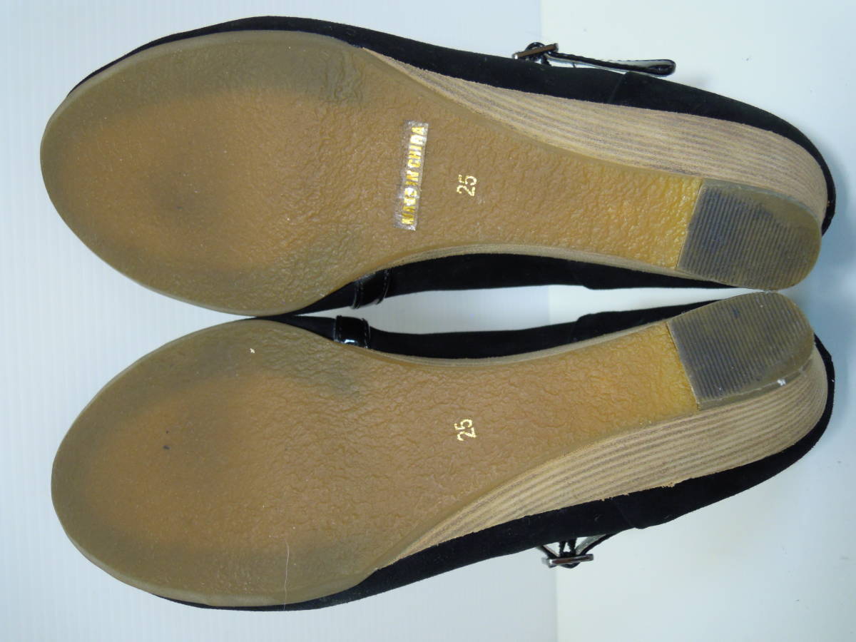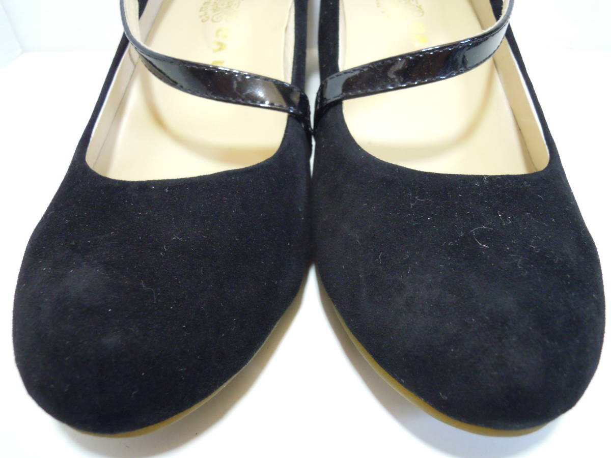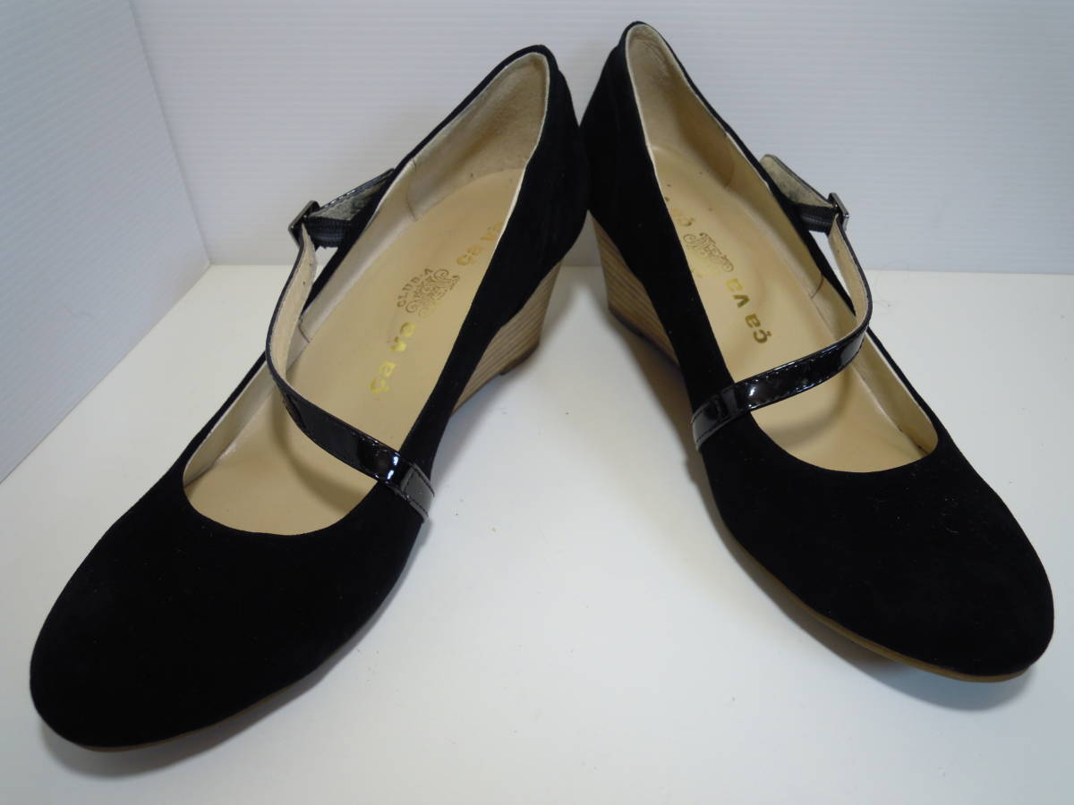 【ブランド・形態】 cavacava サヴァサヴァ 斜め掛けストラップ スエード ウエッジパンプス サイズ25.0cmです。 【カラー】 ブラックです。 掲載の実物写真はPC環境や光の加減により実物と色合いが若干異なる場合があります。 【特徴】 cavacavaサヴァサヴァの斜め掛けストラップ付きスエードレザーパンプスです。 綺麗なラウンドトゥのパンプスをスタックドウェッジソールにデザインしました。 シンプルなデザインだからこそ本革ならではの味わいが魅力です。 ストラップはエナメルレザーで5段階調整のゴム付きタイプになります。 ウェッジヒールでスタイルアップ出来るアイテムです。 アウトソールがラバ-なので返りが良く、滑り止め効果もあります。 ヒールがあるのでパンツにもスカートにもカッコ良く決まります。 ヒール高さ:約6.0cm、最大幅:約8.5cm、 【状態】 少々使用感はございますが、特に目立つダメージは見受けられず、使用に問題無いと思われます。 アッパーは比較的にきれいです。 アウトソールかかとは少しすり減りがあります。 保管箱はありません。 【材質】 アッパー:本皮革 アウトソール:ゴムラバー 【サイズ】 25.0cm、 質量:480g #サヴァサヴァ #cavacava | |||