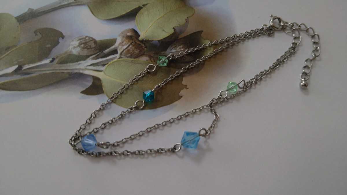 シルバーカラーチェーン水色・黄緑ビーズのブレスレットです