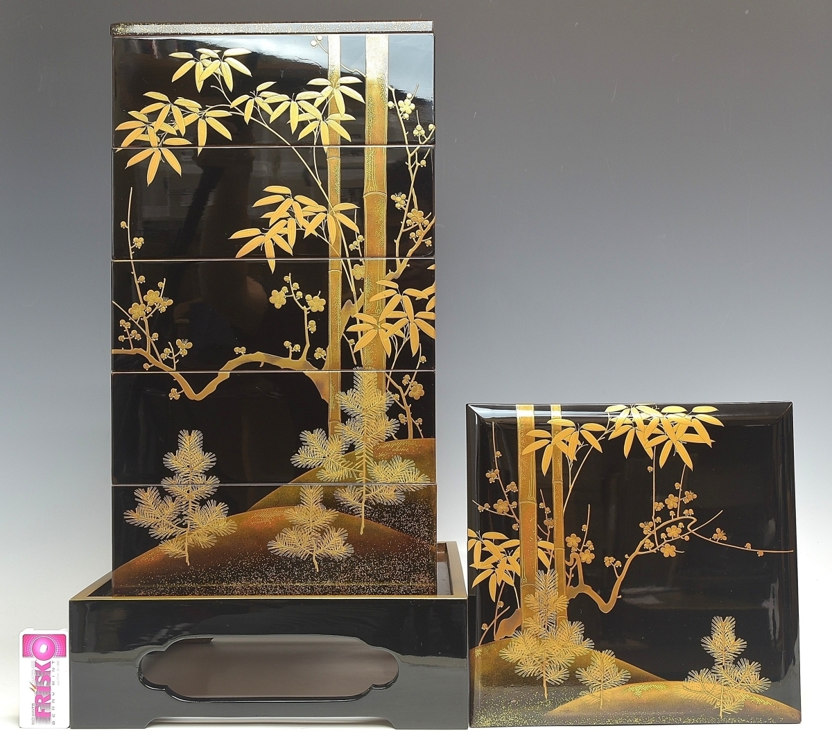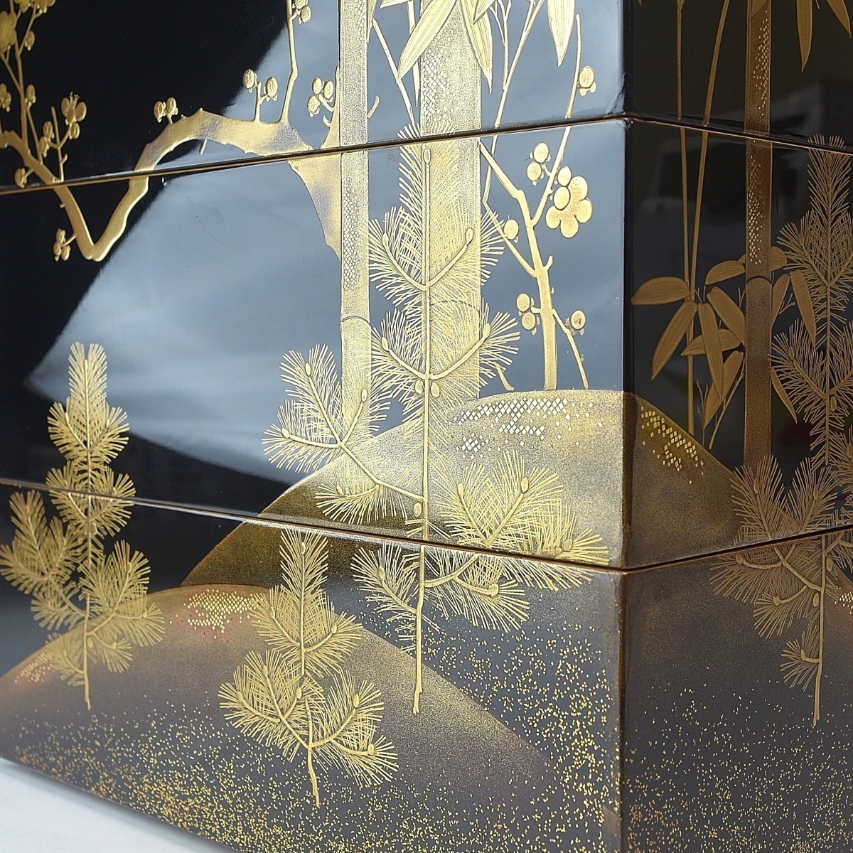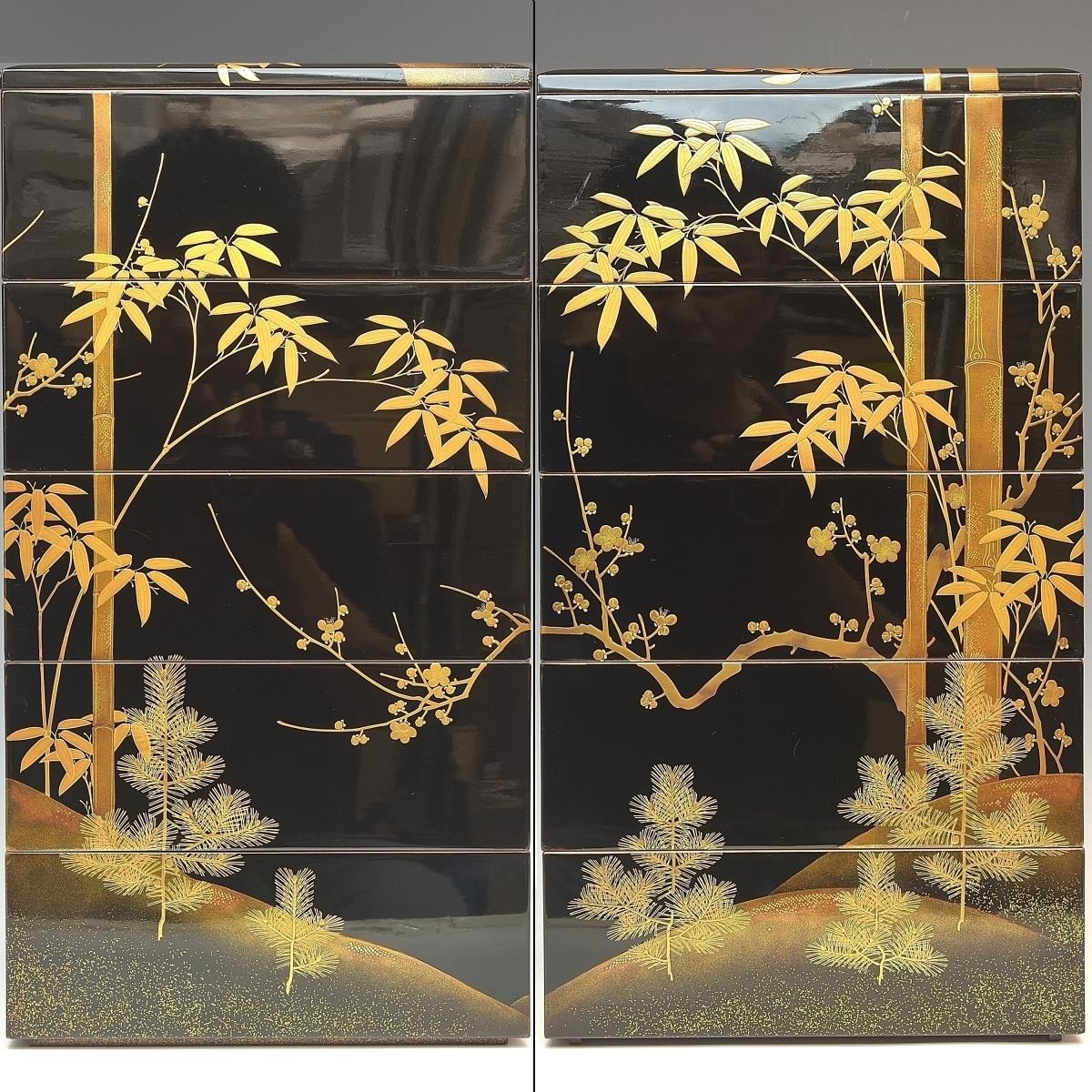 商品名 | 【趣楽】 時代 松竹梅図蒔絵五段重箱 台付 上質蒔絵 重箱高さ44cm M1511 | ||
