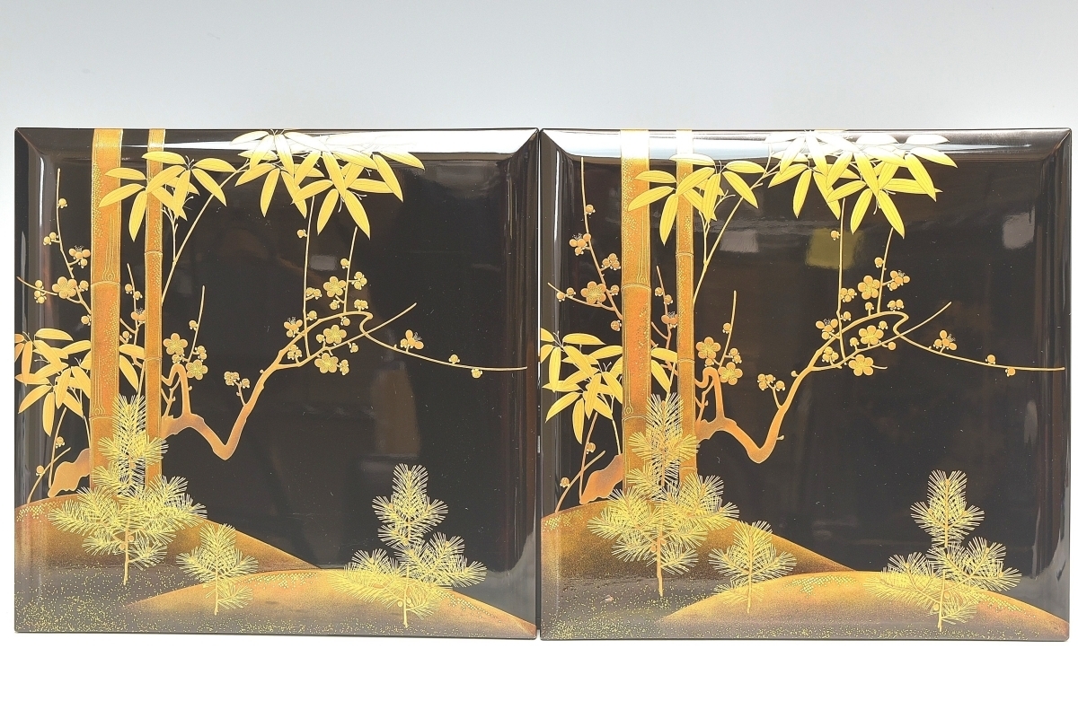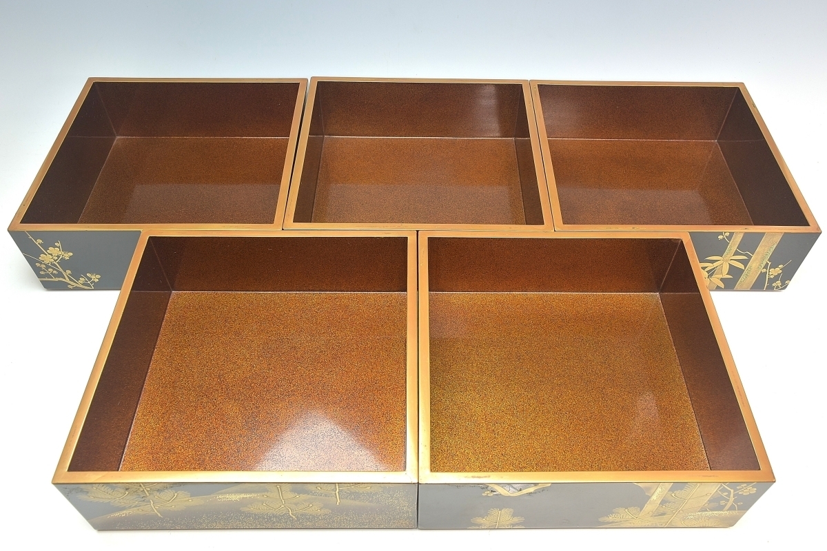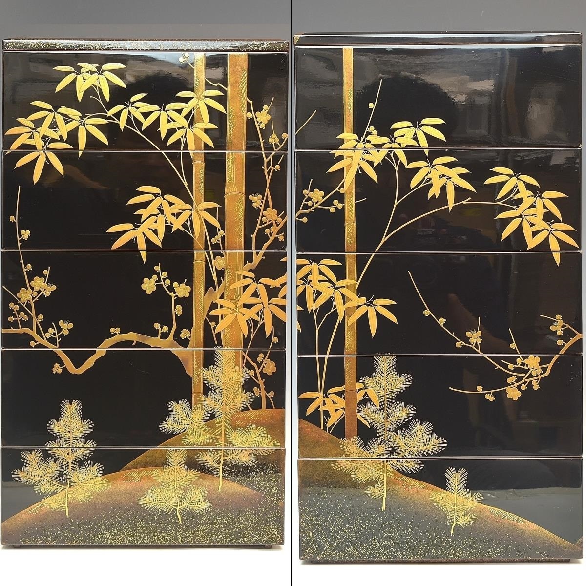 商品名 | 【趣楽】 時代 松竹梅図蒔絵五段重箱 台付 上質蒔絵 重箱高さ44cm M1511 | ||