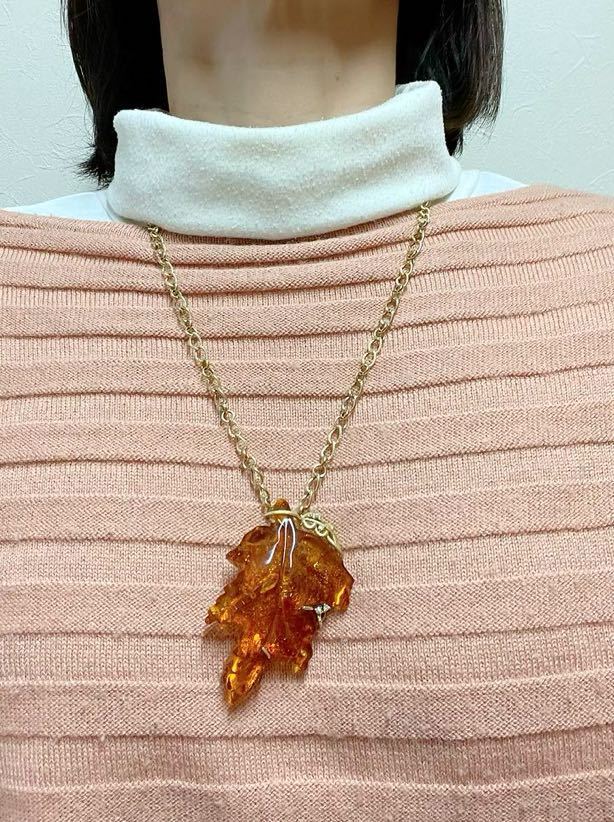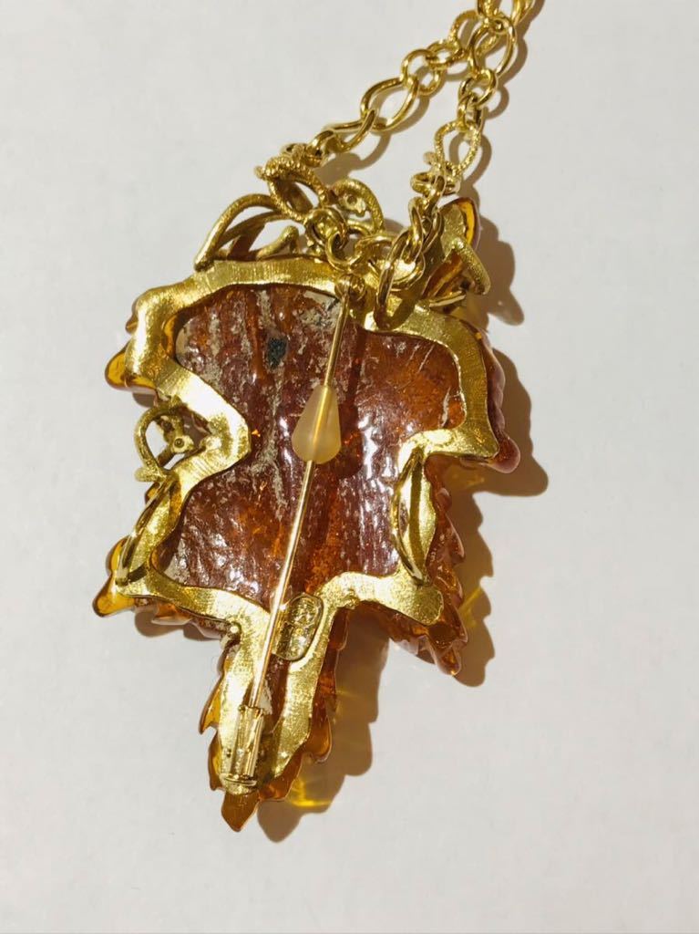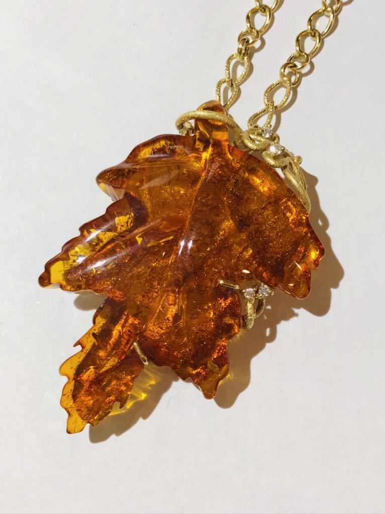 こちらは、750YGデザイン柄チェーンに、K18台にリーフ型琥珀&メレーダイヤ4石付きペンダント兼用ブローチ付きネックレスです。