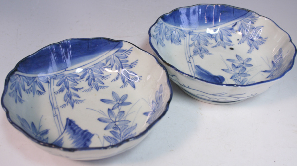 古伊万里、染付竹笹文なます皿、2客です。時代は江戸時代。涼しげな染付のデザイン。少し深めの鉢は普段使いに良さそうです。裏には唐草文様。蛇の目高台です。縁は輪花に成形されています。状態は比較的良いですが、古いものですので、汚れ、スレキズ、くっつき、フリモノ、釉切れなどございます。状態の詳細は画像にてお確かめください。箱は付いておりません。お分かりの方、宜しくお願いいたします。
