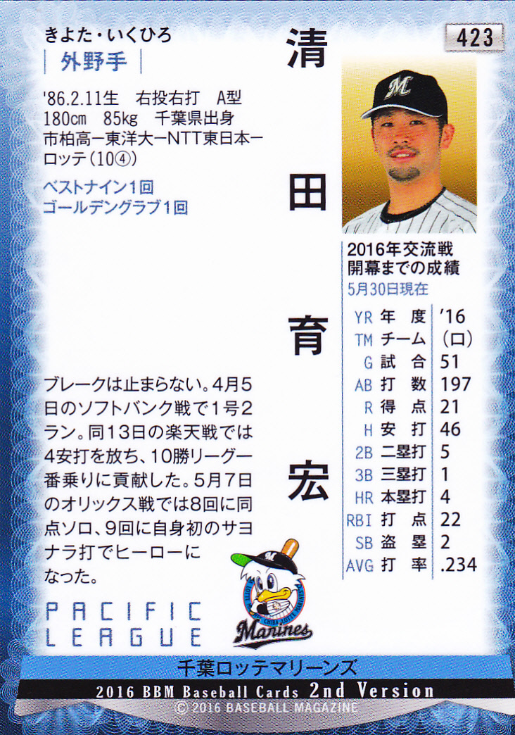 BBM2016ベースボールカード2nd 423 清田育宏 千葉県 市立柏高校 東洋大学 千葉ロッテマリーンズ