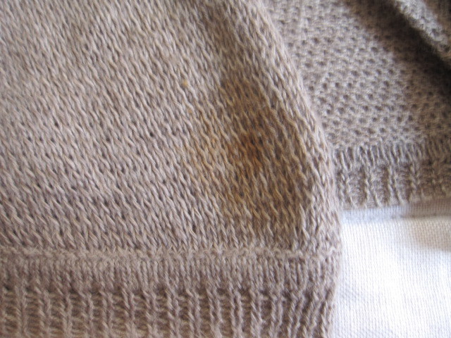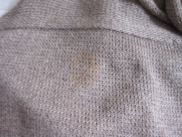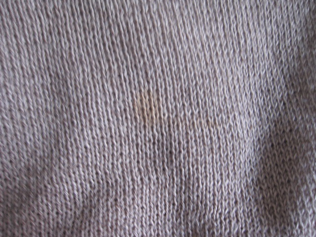 画像のように前右裾、うしろの上・下にしみがあります。同色の茶色っぽいしみですが気になる方には向きません。
