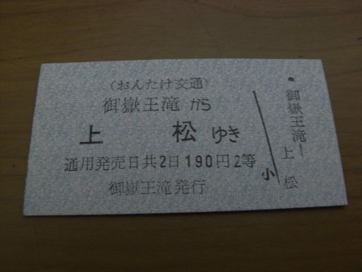 おんたけ交通国鉄連絡乗車券 御嶽王滝から上松ゆき 190円 2等 御嶽王滝発行