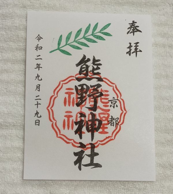 ◆京都熊野神社(左京区)◆御朱印「熊野神社」(梛) 令和2年(2020年)9月 |