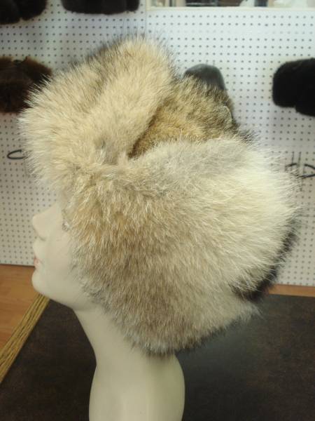 • コヨーテ毛皮ロシアンスタイル・ハット。紐をおろして耳部分も暖かく、または紐をトップ部分で留めて着用もできます。あたたかくスタイリッシュな一点です。