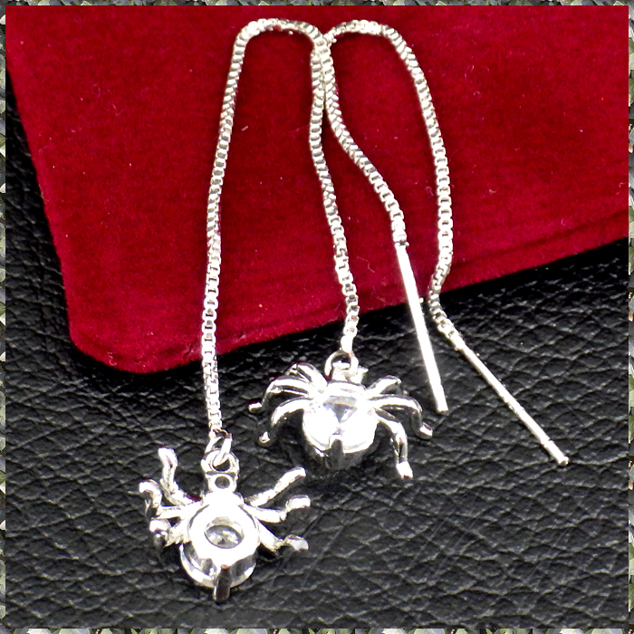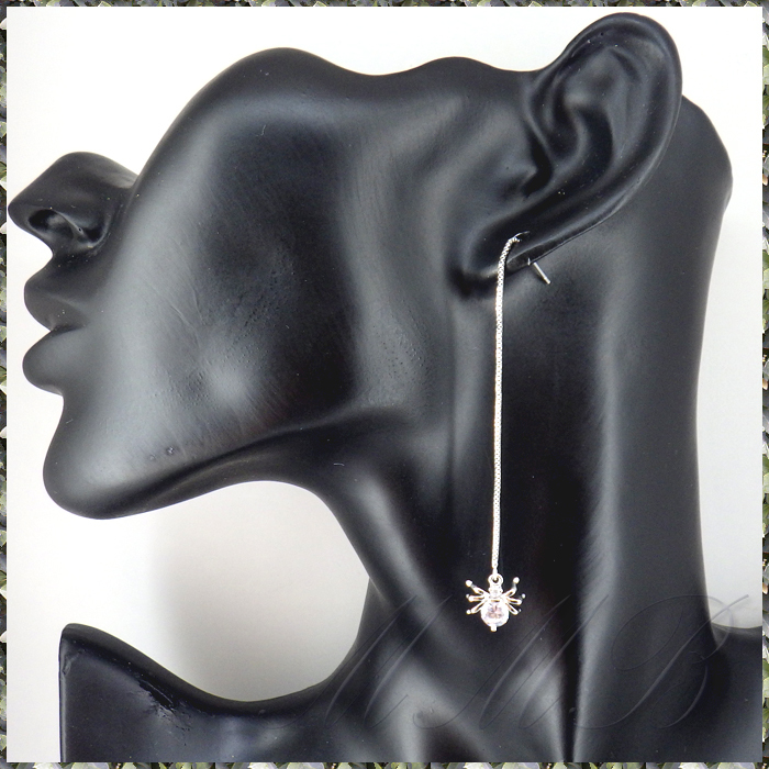 [EARRING] White Gold Plated 2Cz Spider Elegant Chain Dangle Earring クモ (蜘蛛) スパイダー 65mm チェーン ロング ダングル ピアス