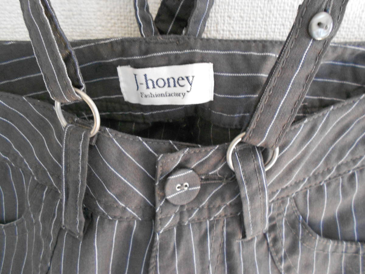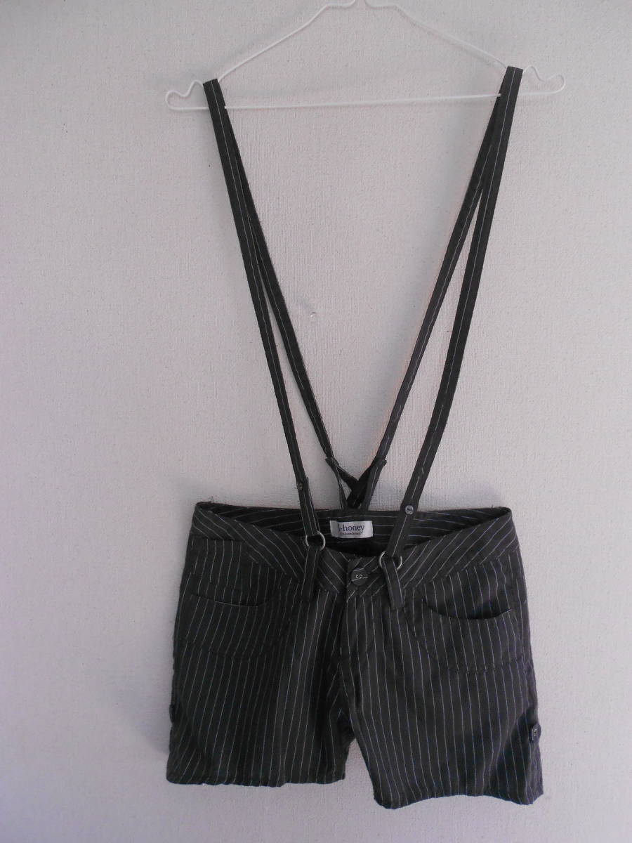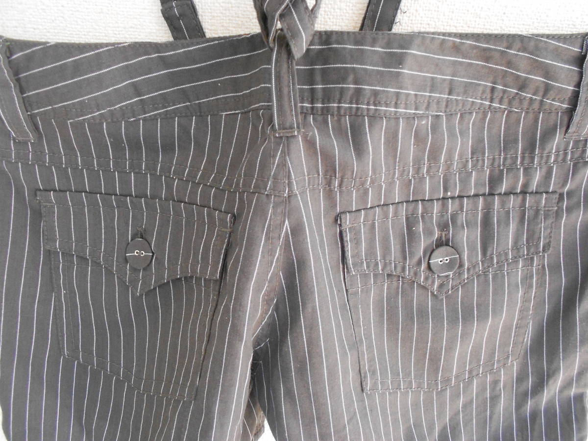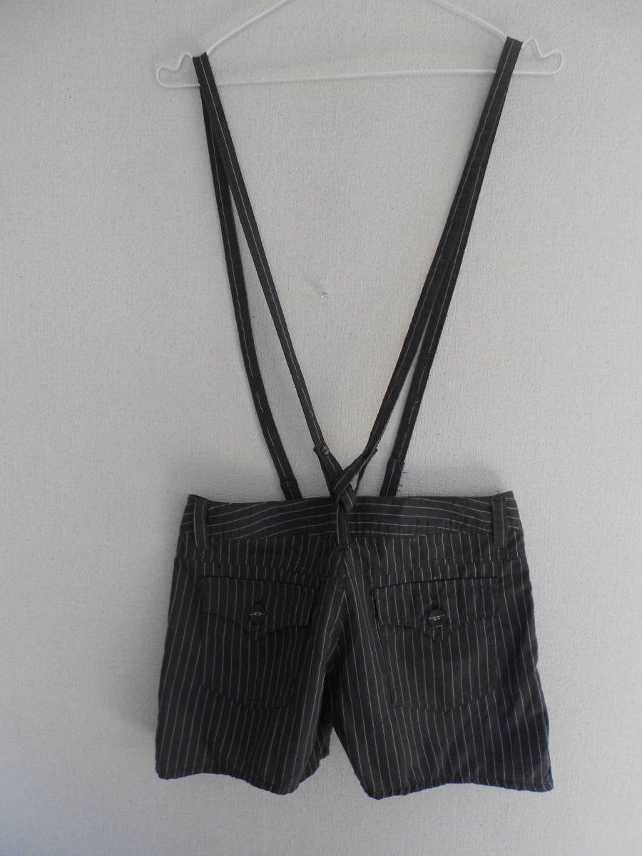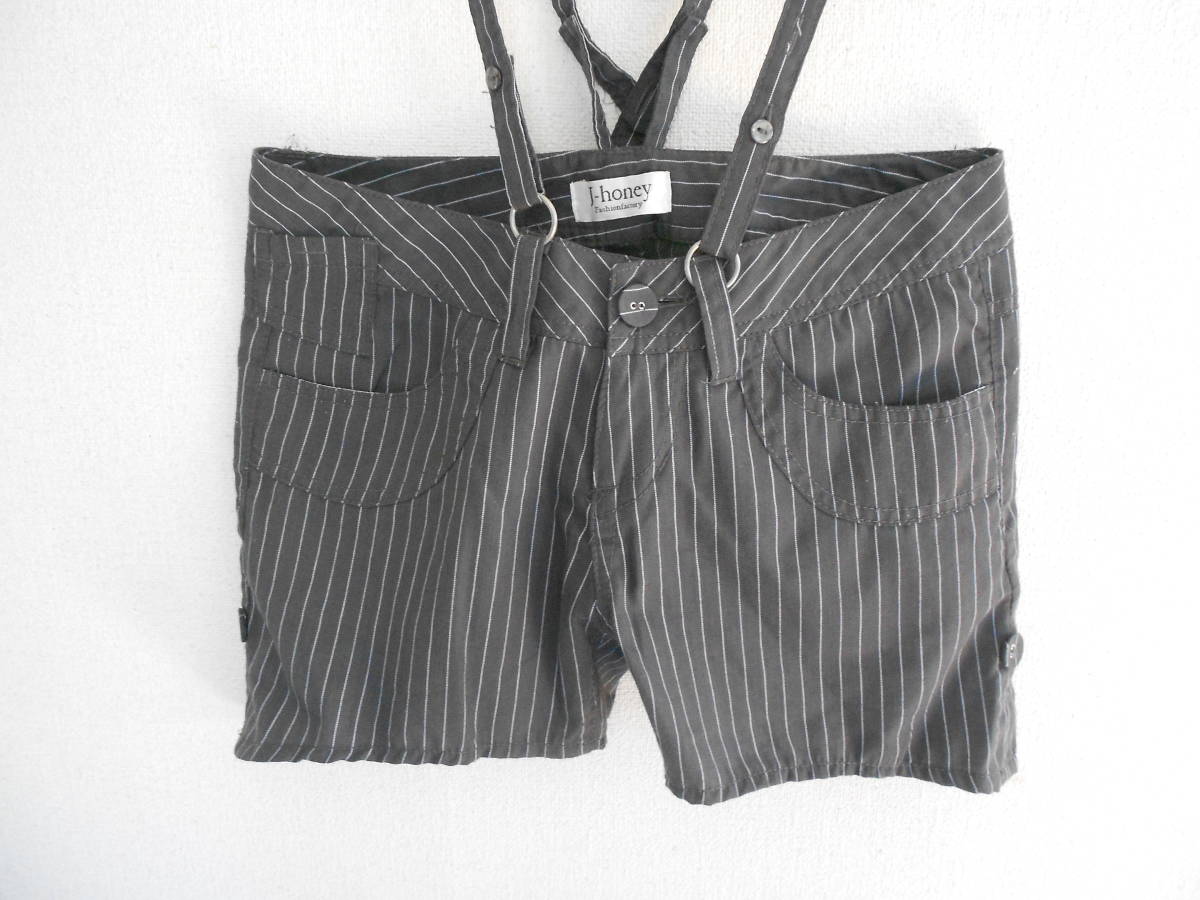 チャコールグレーにストライプ柄の釣りベルト付きショートパンツ、前後に4個っと小さなポケット1個が付いています。素材はポリエステル65%、レーヨン35%、サイズはウエスト64、ヒップ87、ズボン脇総丈32,5、股下10です。ほとんど履いていないので新品同様です。送料はクリックポスト185円です。