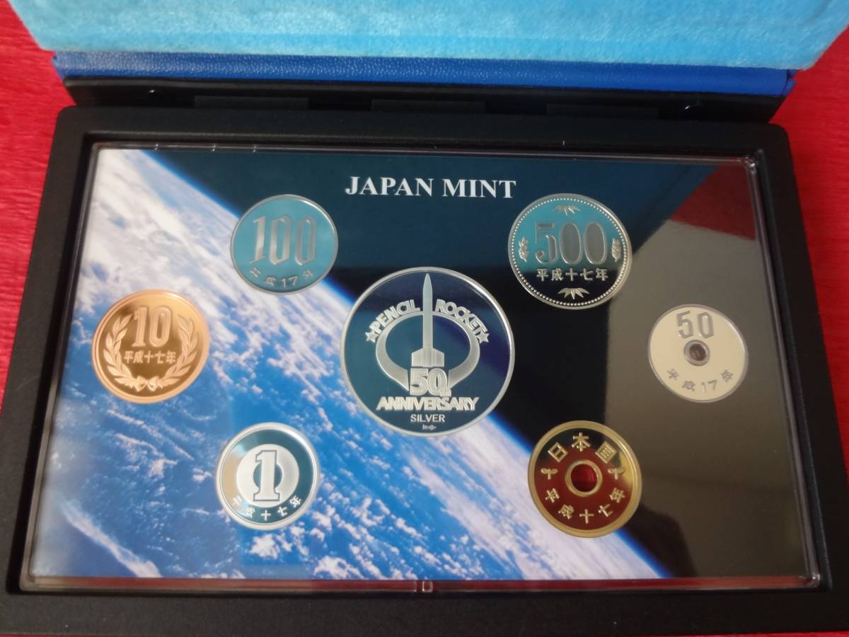 この貨幣セットは、現在のロケット開発の端緒となるペンシルロケットの発射か平成17年で50周年となることを記念し、造幣局が製造販売したものです。