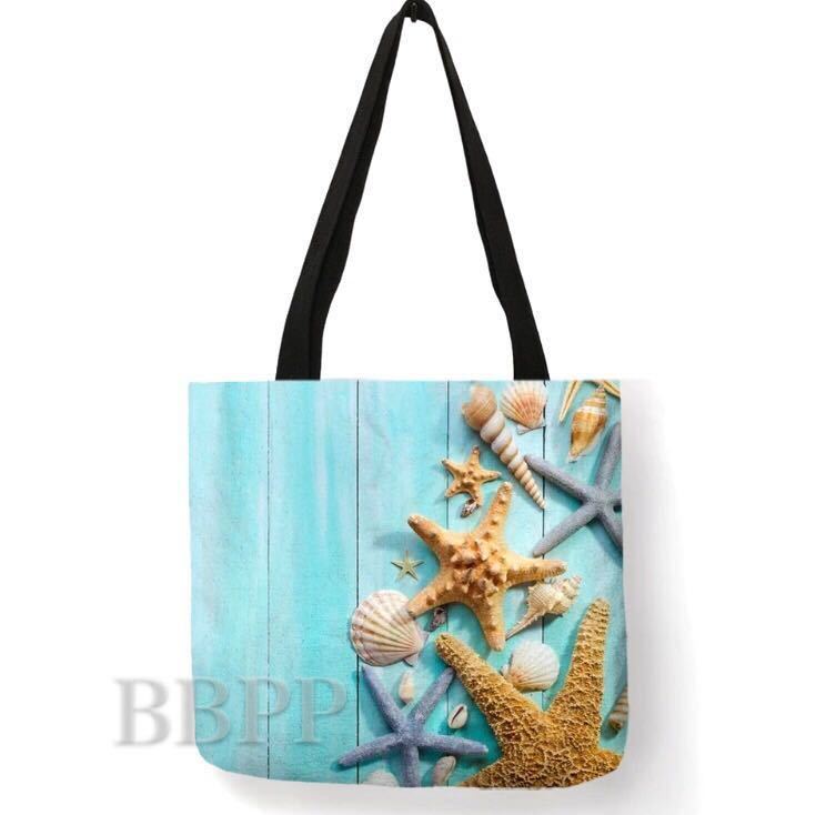 ・貝殻やヒトデなどを描がき、海をモチーフにデザインされたトートバッグ
