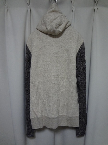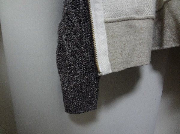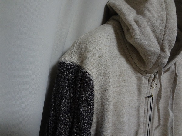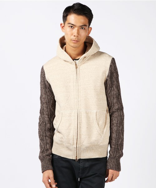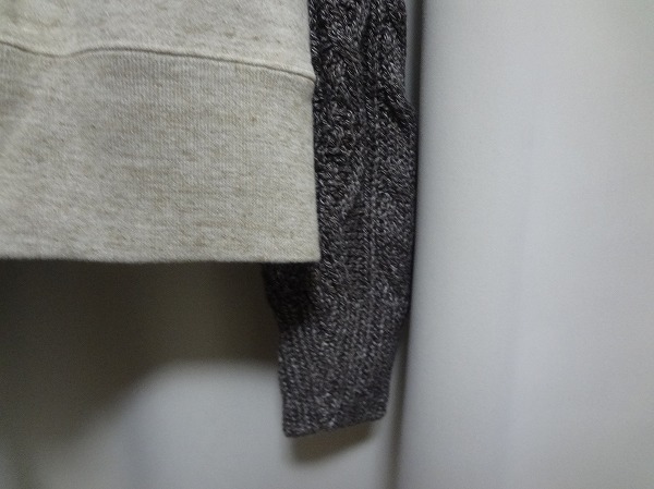 袖にはざっくりとした素材感のアラン柄ニット、身頃のスエットは度詰めのしっかりした裏毛を使い、仕上げはワッシャー加工により杢感ある自然な風合いを出しています。