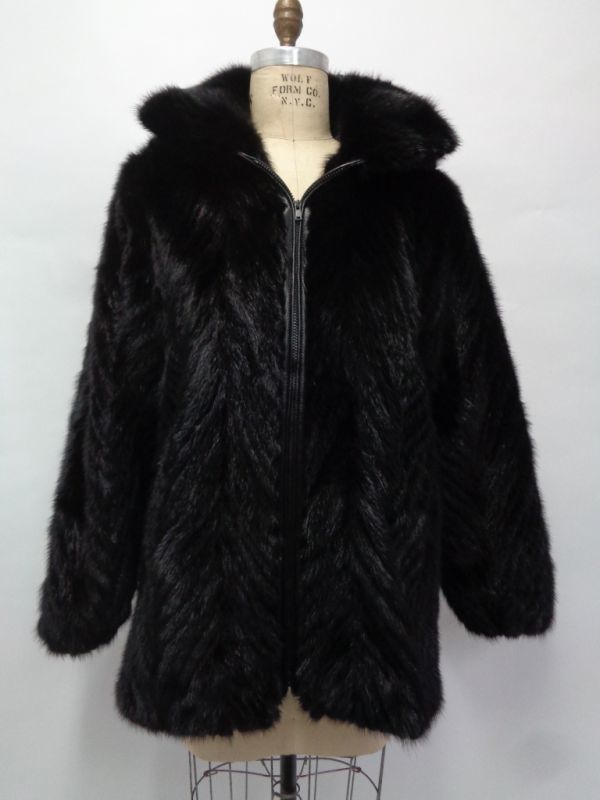 スタイリッシュなブラック・ミンク毛皮ファー・ジャケット。つやのあるミンクテール・ファー仕立て。vラインのファー・デザイン。ウィングカラー。フロントファスナー。取り外せるフードつき。