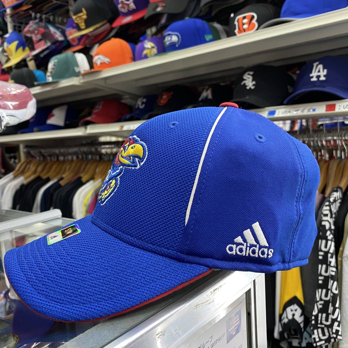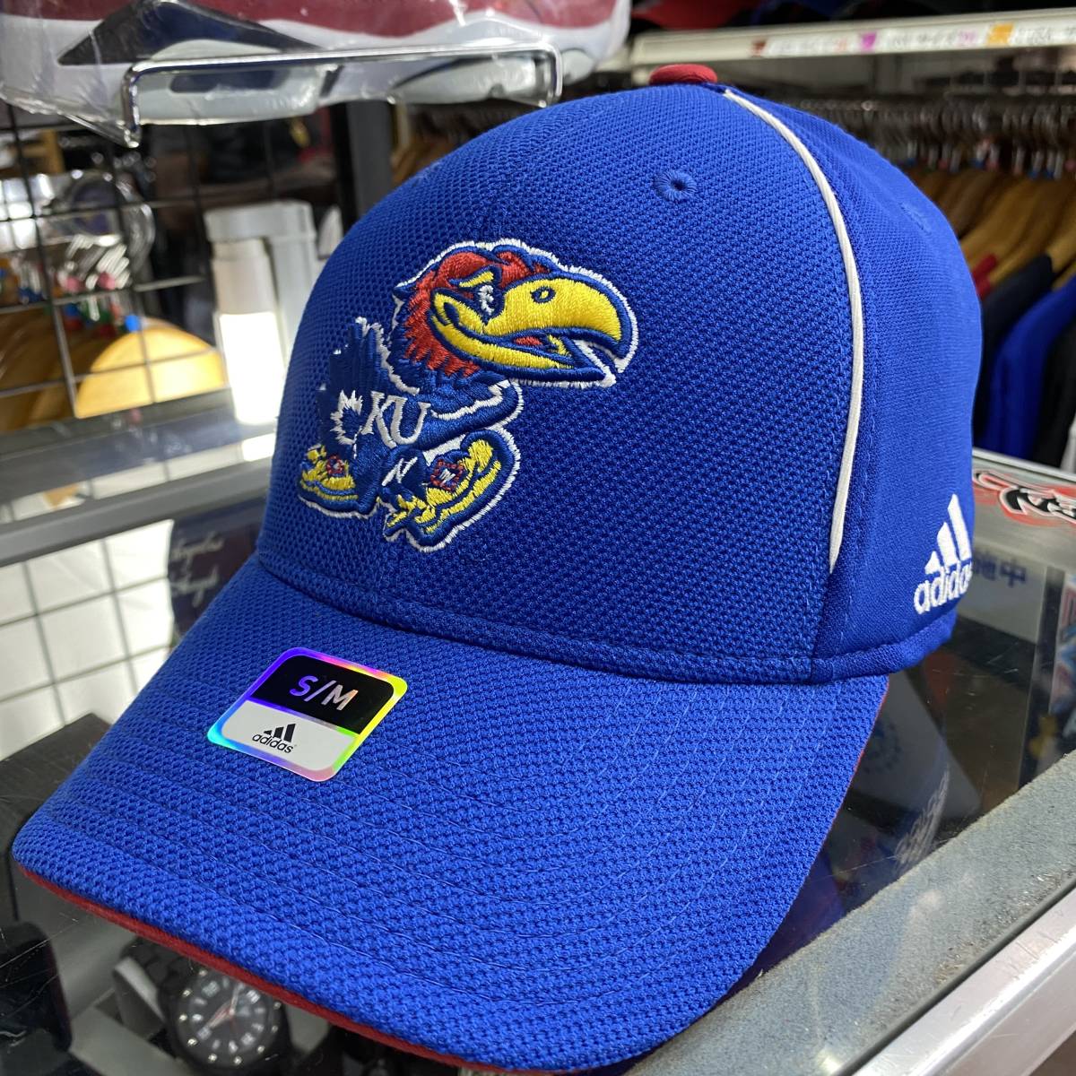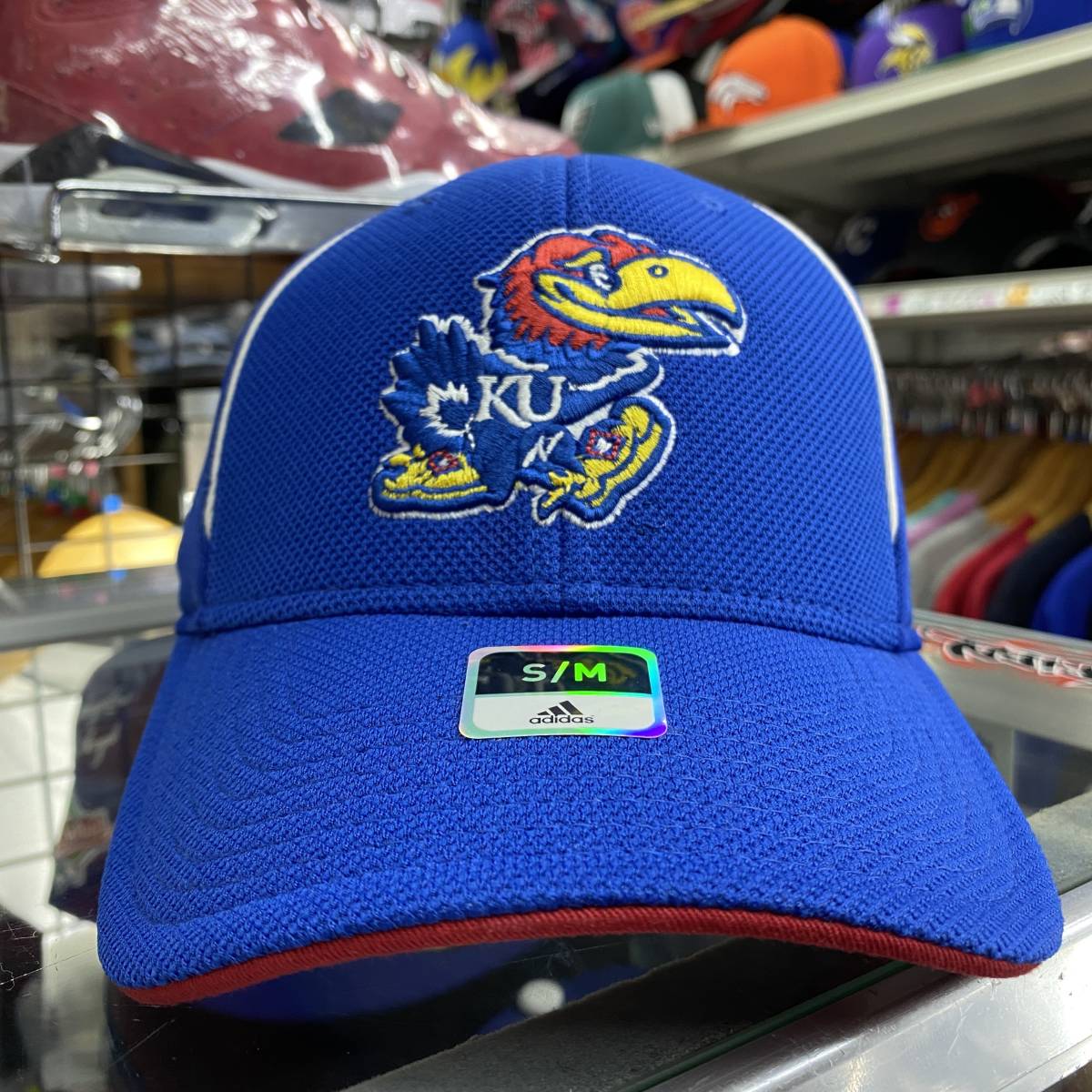 【S/M】 USA正規品 Adidas アディダス Collegiate カンザス大学 カンザス KU ジェイホークス 青 ストレッチ フレックス キャップ 帽子