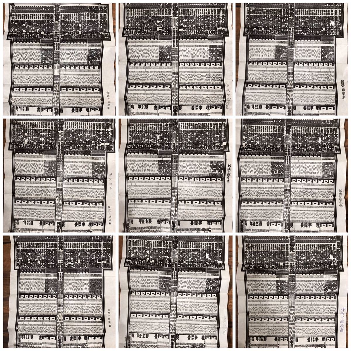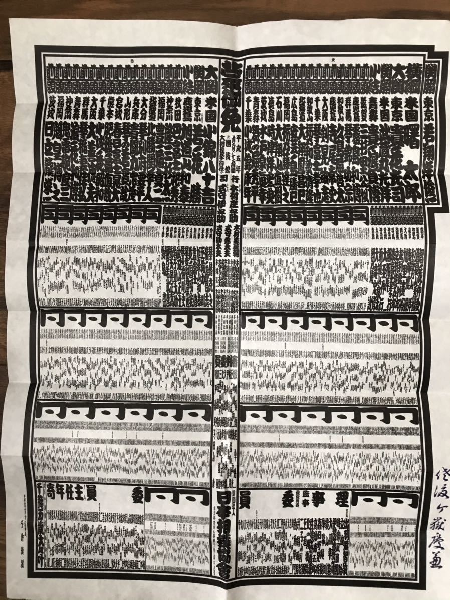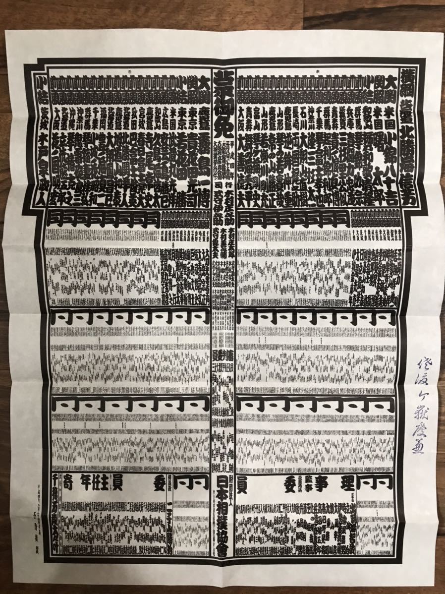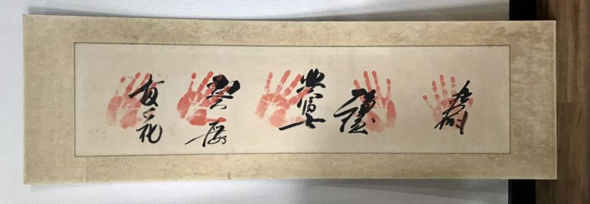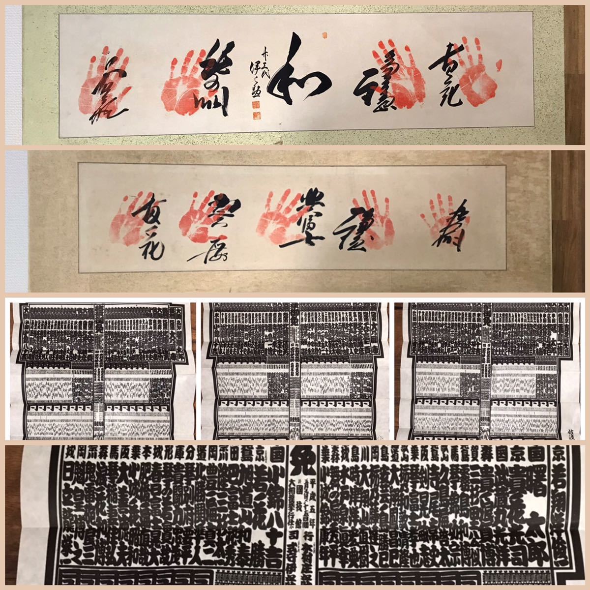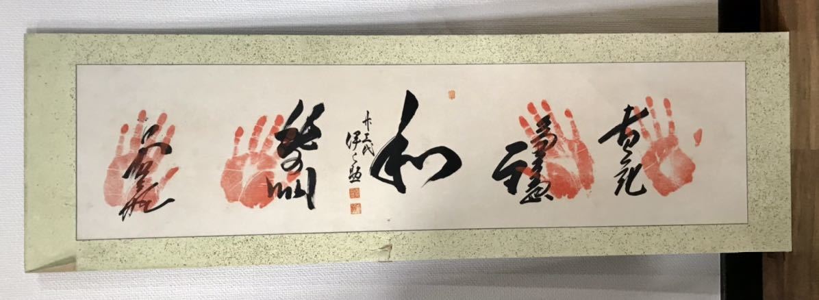 近代大相撲の花形力士の手形で、真ん中に立行司、第23代式守伊之助の「和」の書を挟んで右より貴ノ花(第65代横綱)、北の湖(第55代横綱)、輪島(第54代横綱)、若ノ花(第66代横綱)、の手形では?