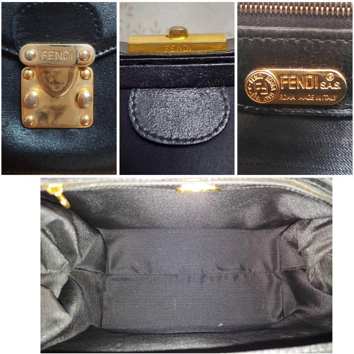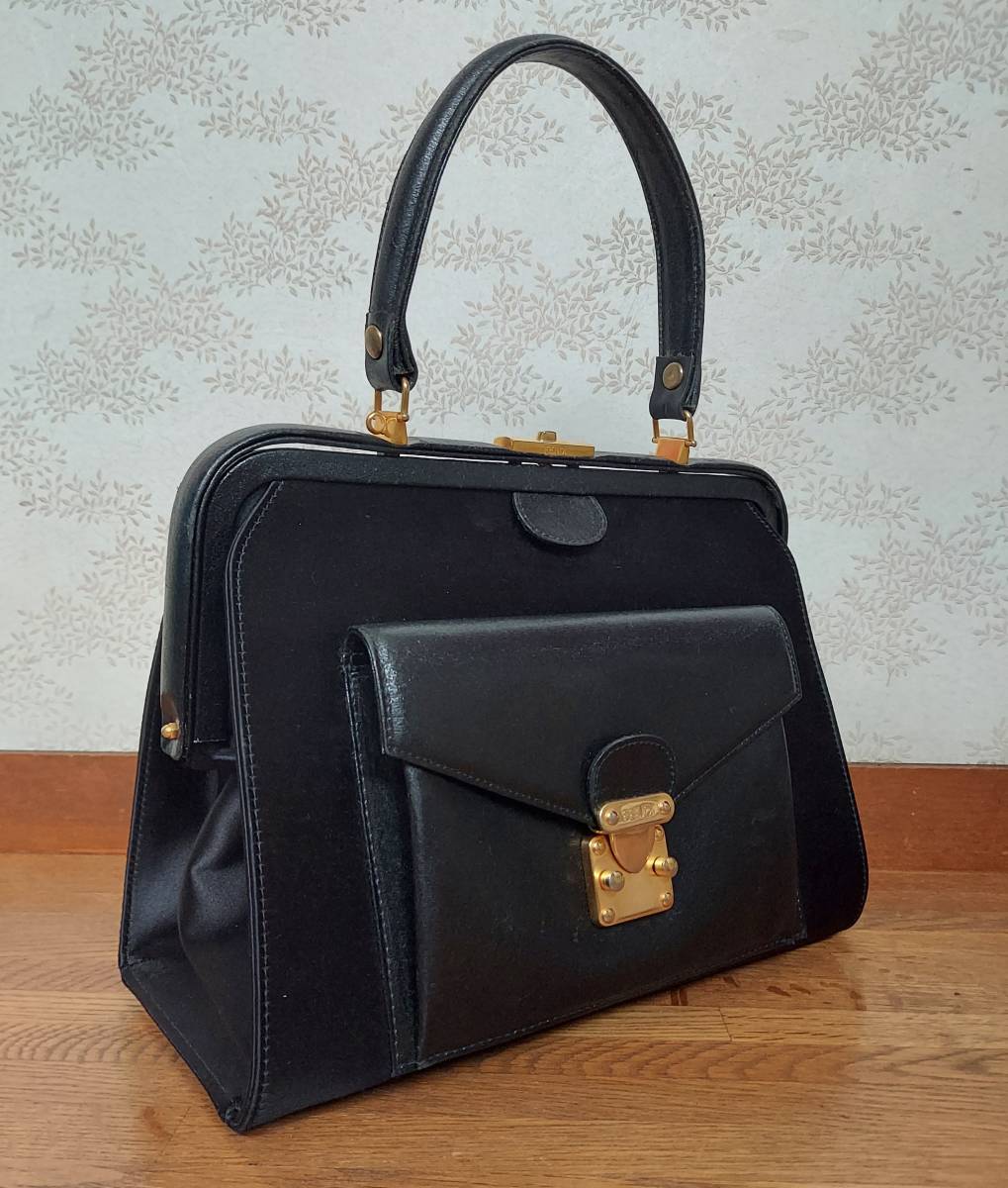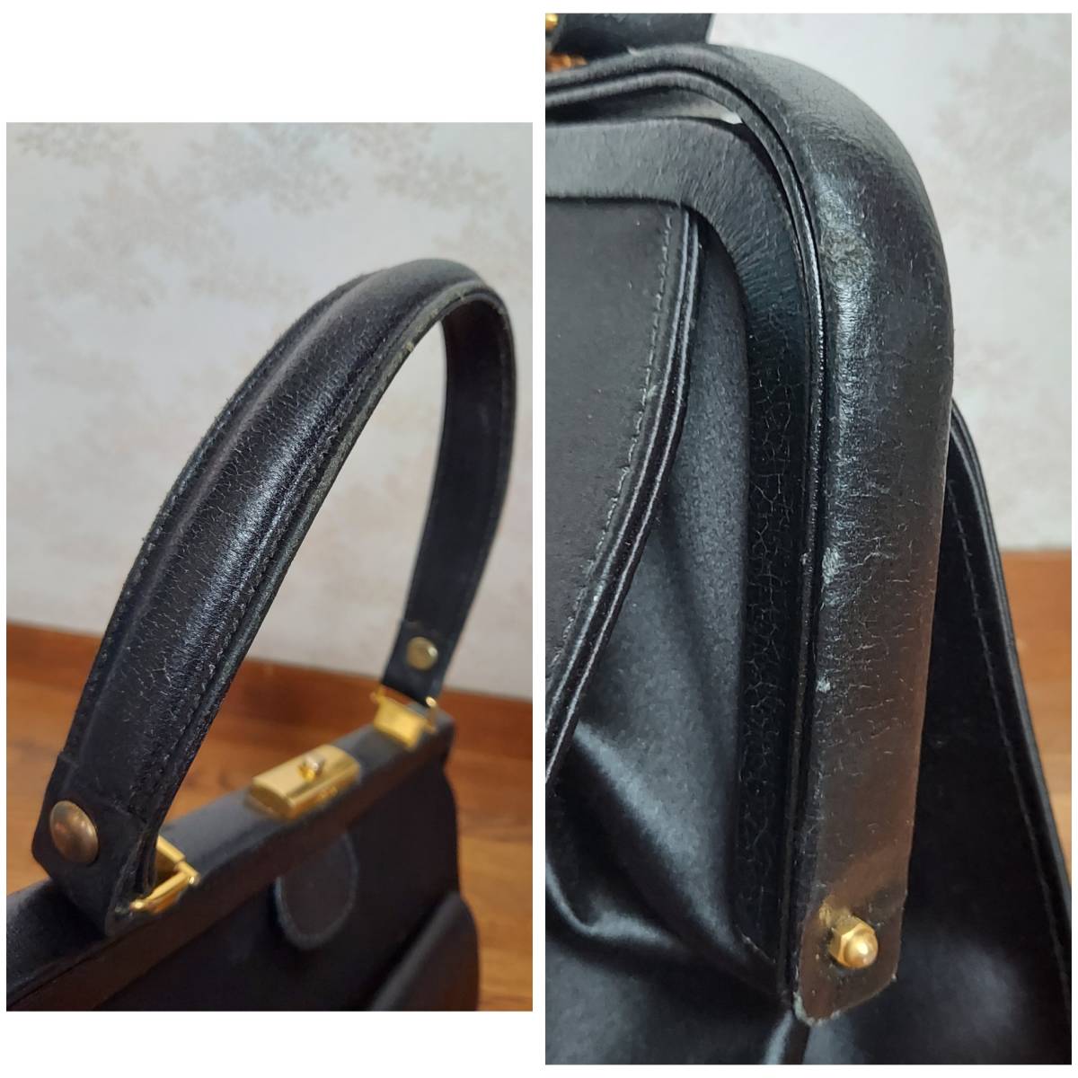 サテン部分はかなり綺麗な状態ですが、レザー部分(前ポケット、ハンドル、開け口部分の枠)は劣化、ダメージございます。スレ、ひび割れなど。