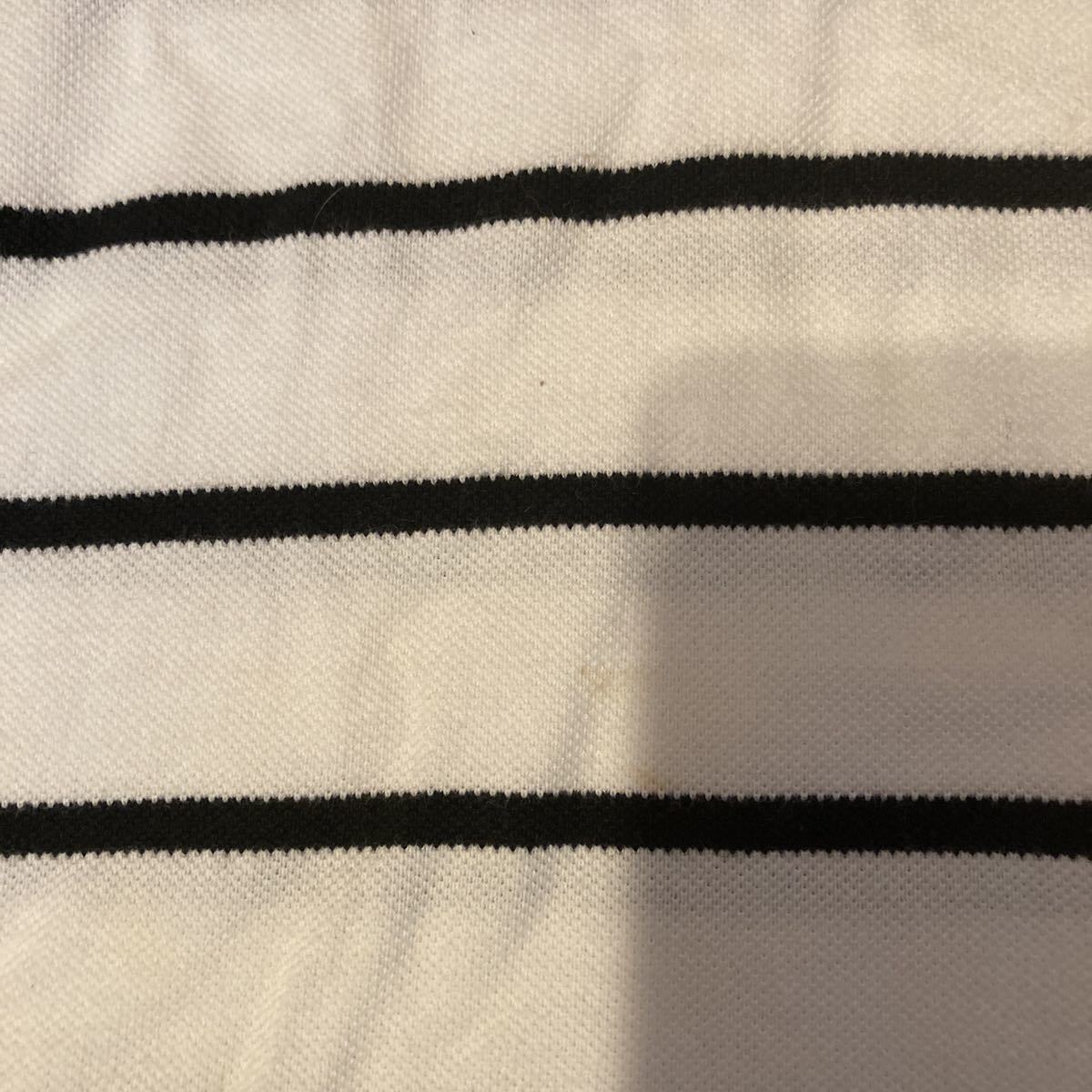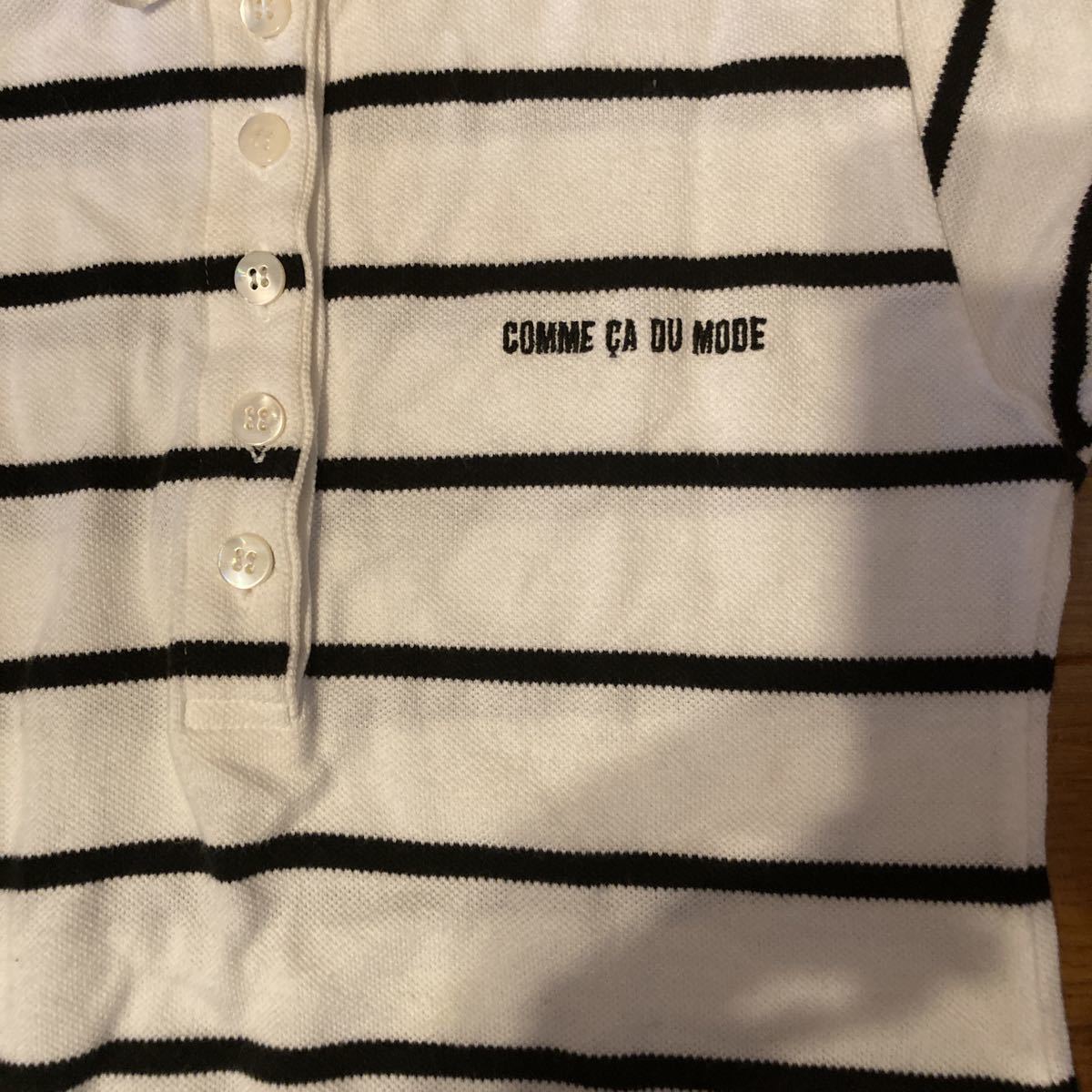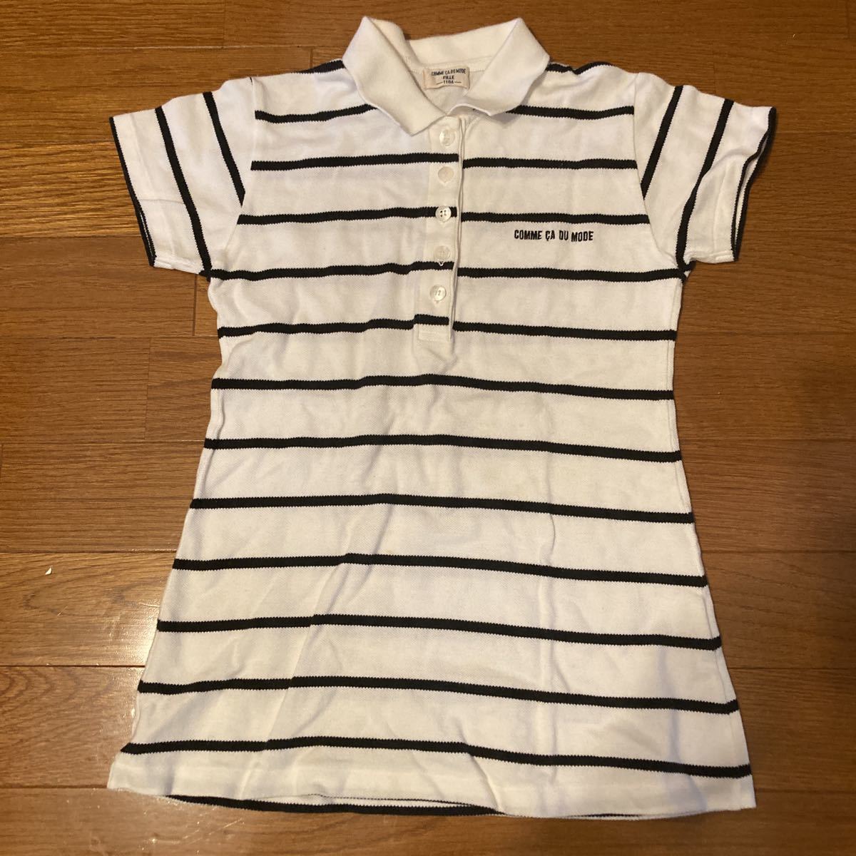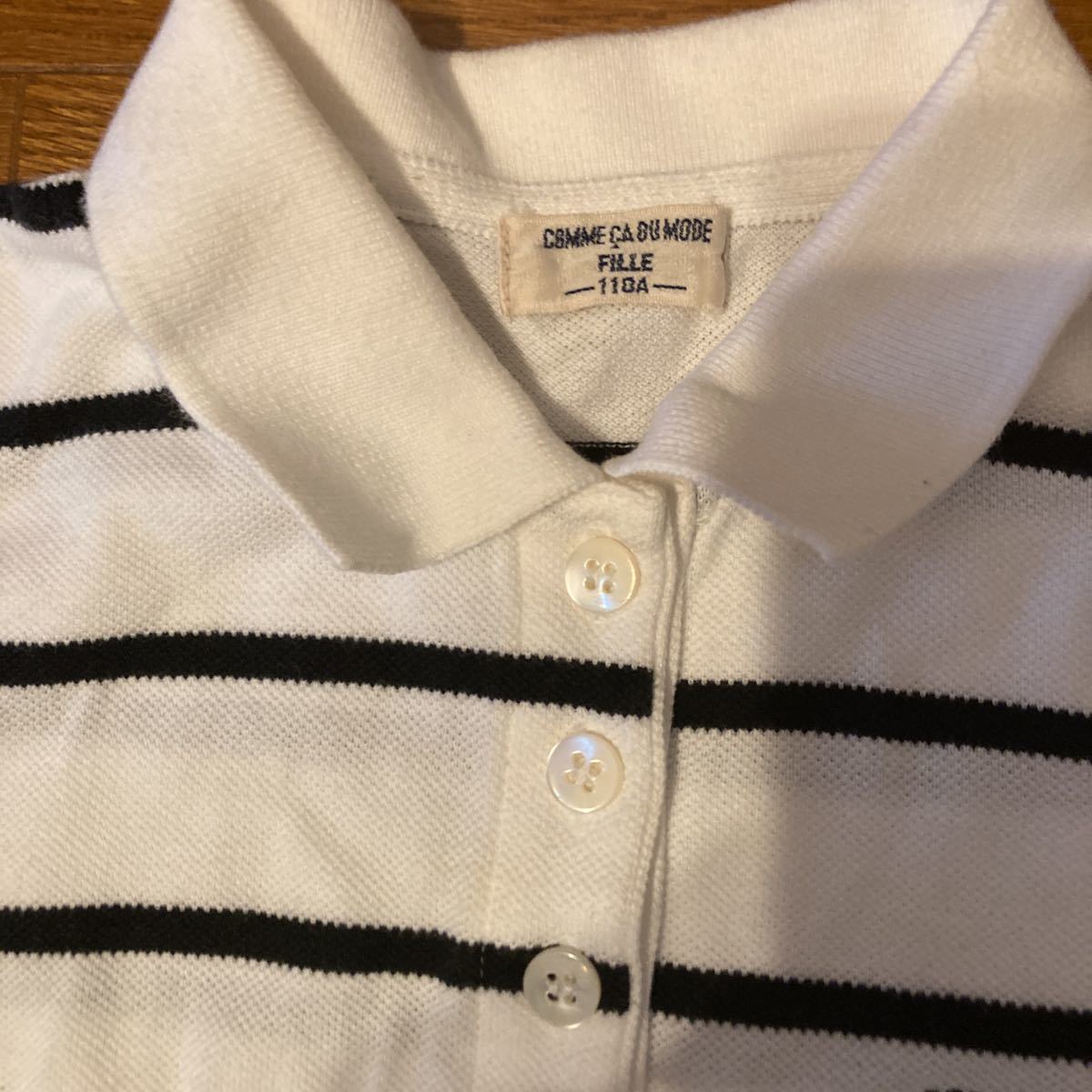 コムサデモードのポロシャツになります。サイズは110ですが、気持ち大きめかなと思います。写真のようにうっすらと汚れがございますが、あまり目立たないかと思います。ボーダーですので、ジーパンでもなんでも合わせやすいです。