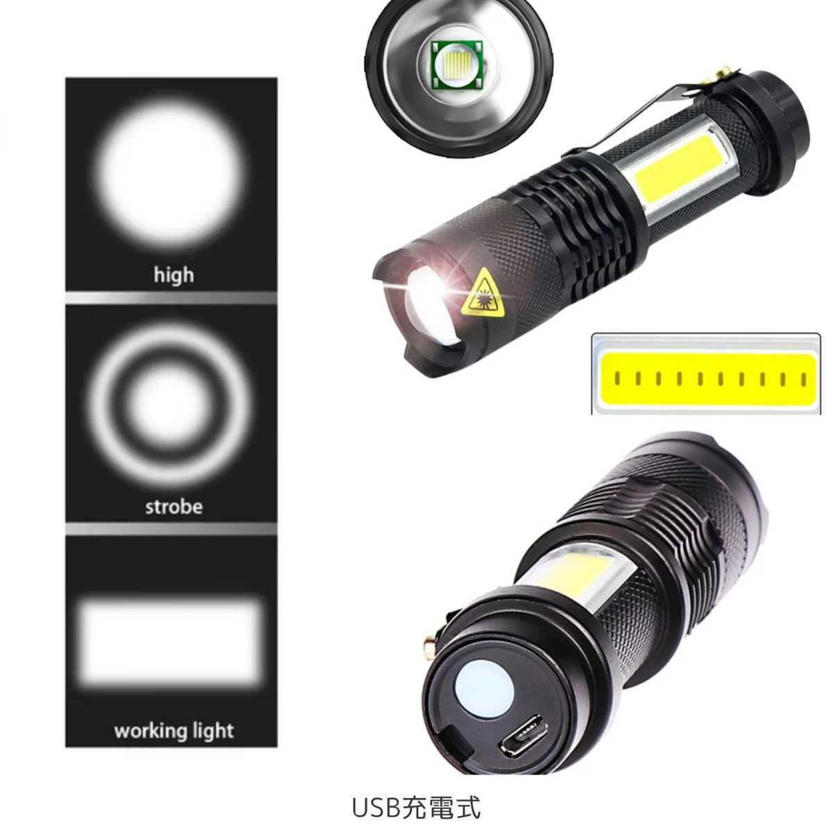 小型USB充電懐中電灯、内蔵リチウムイオン充電電池型強光懐中電灯、直接USB充電可。