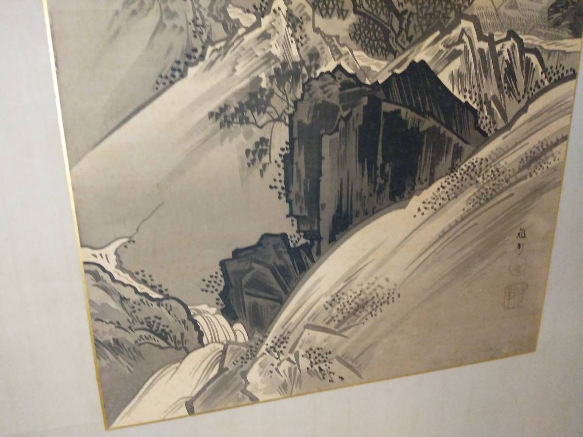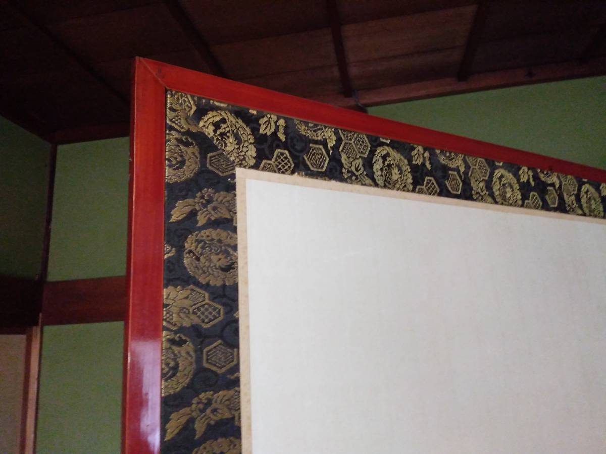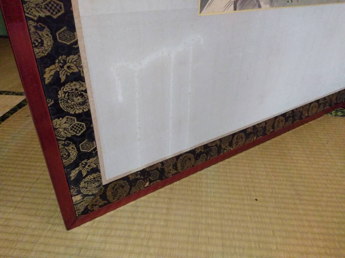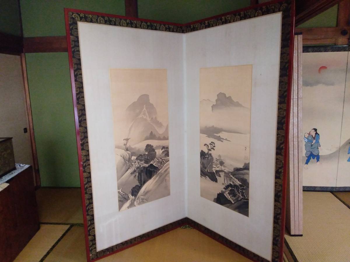 引取限定!紙本 肉筆 2枚折屏風 橋本雅邦筆(東京)です。古い物ですので、シミ、表装にすれ傷等ございます。古い物とご理解の上でお願いします。全体のサイズは幅約186センチ、高さ約96センチです。素人採寸ですので、多少の誤差はお許し下さい。