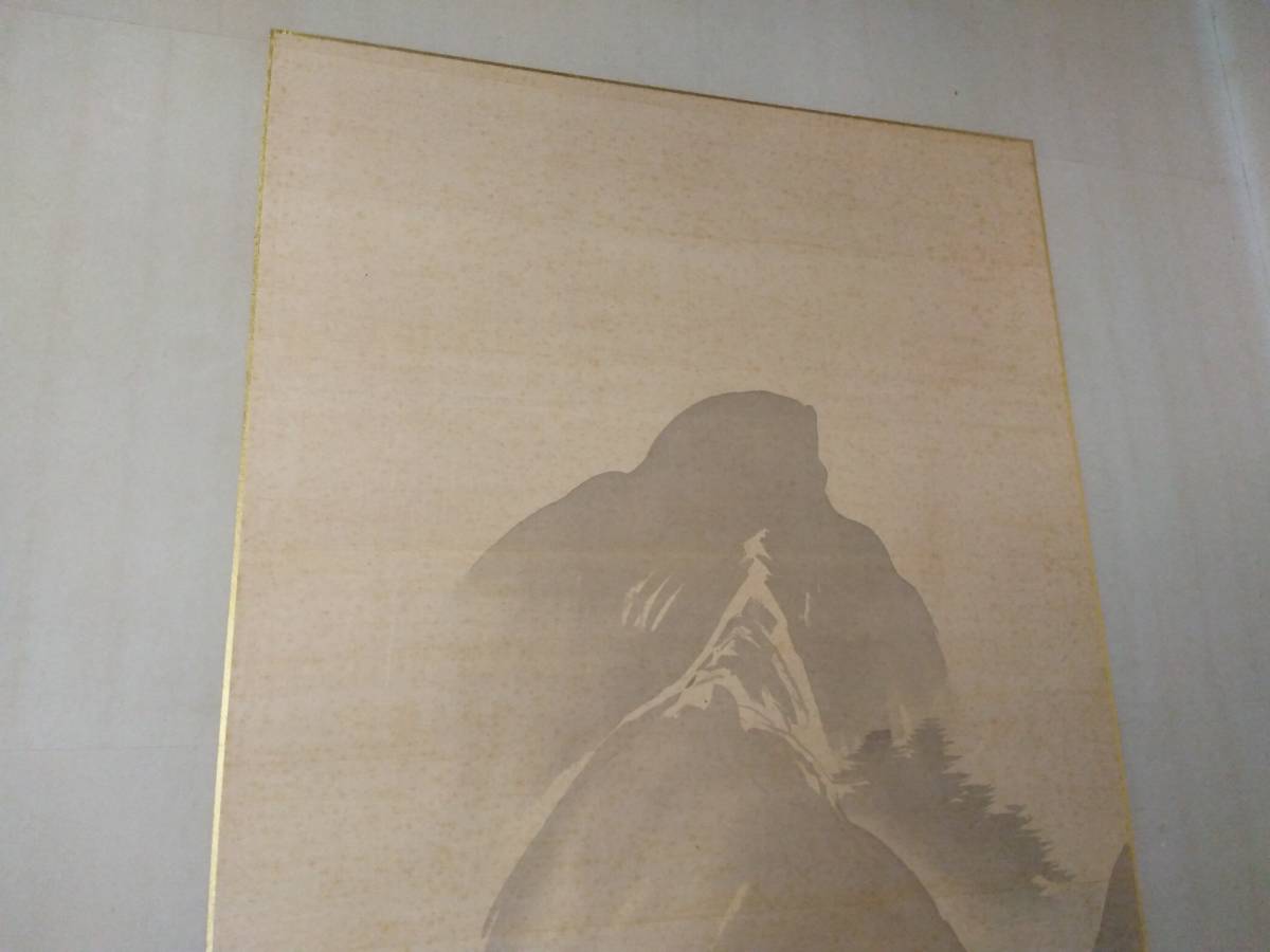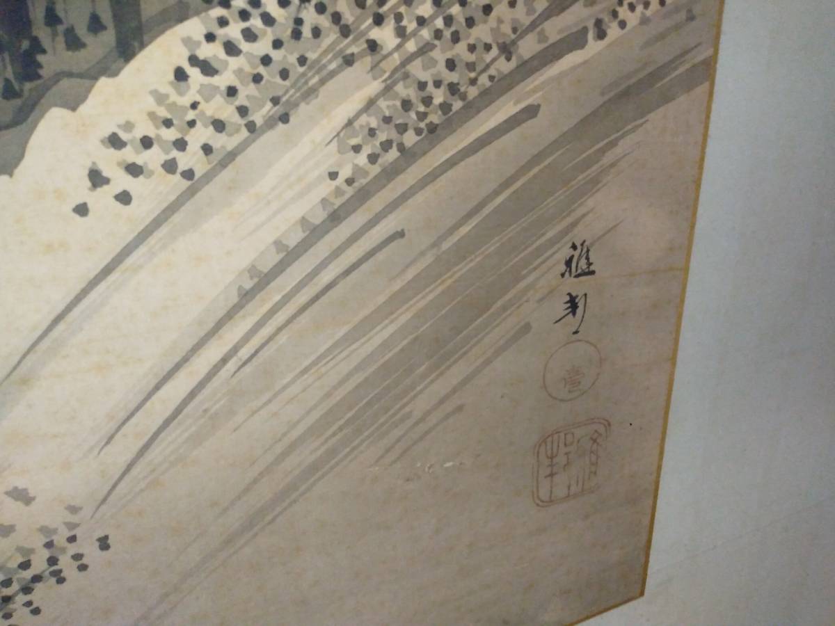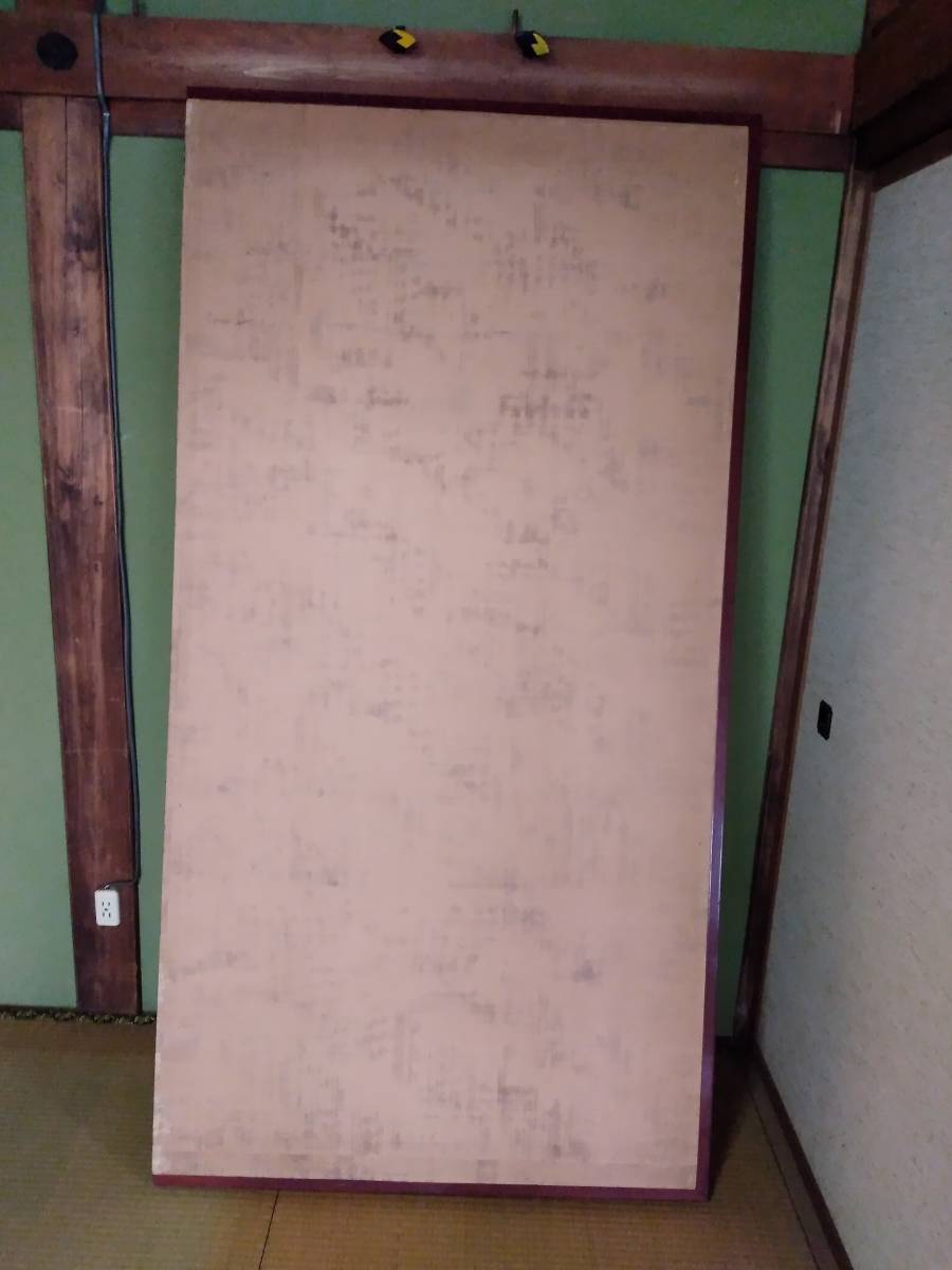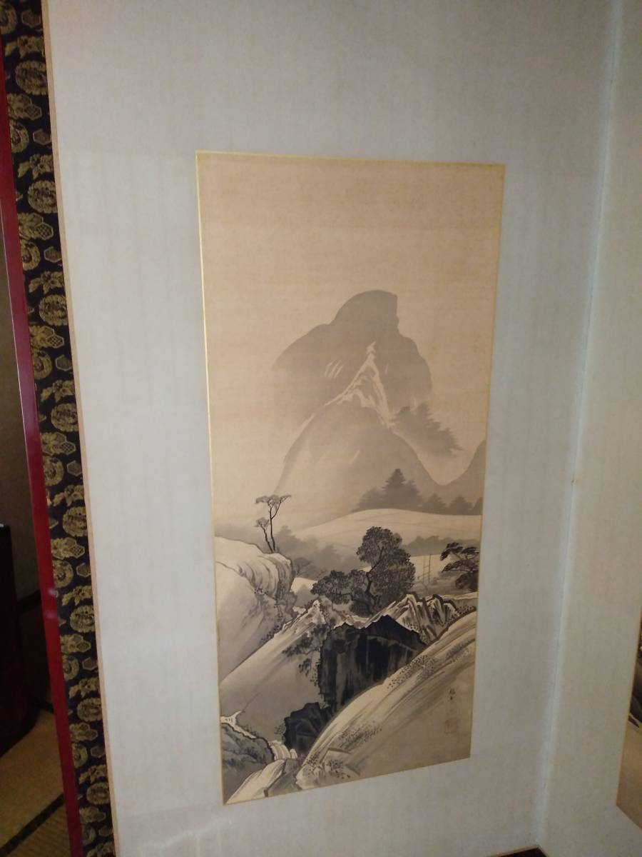引取限定!紙本 肉筆 2枚折屏風 橋本雅邦筆(東京)です。古い物ですので、シミ、表装にすれ傷等ございます。古い物とご理解の上でお願いします。全体のサイズは幅約186センチ、高さ約96センチです。素人採寸ですので、多少の誤差はお許し下さい。