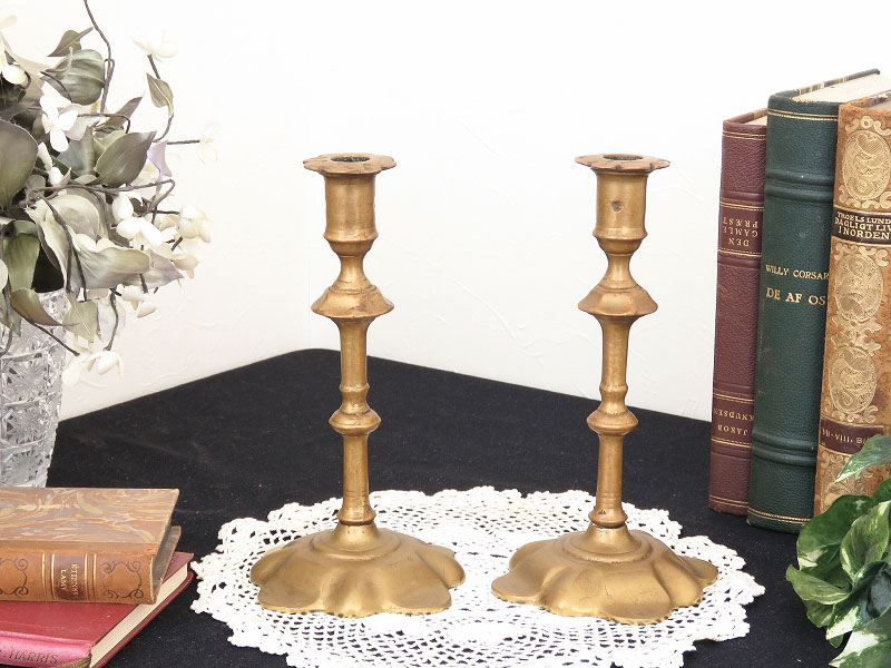 ベルギーで買い付けた真鍮のキャンドルスタンドです。台が花のような可愛らしいデザインのペアの燭台です。カップボードやチェストなどの上に置き、お部屋のインテリアとしてもお楽しみください。