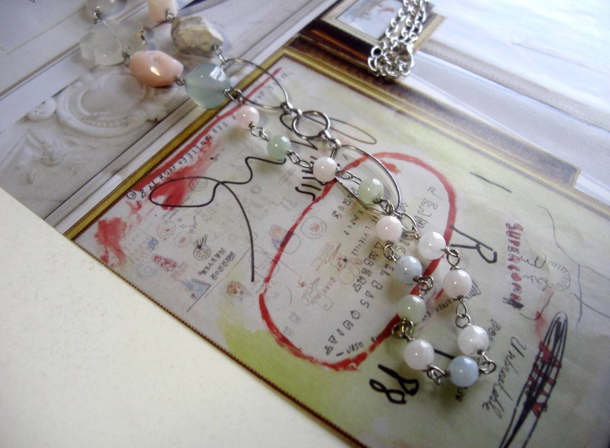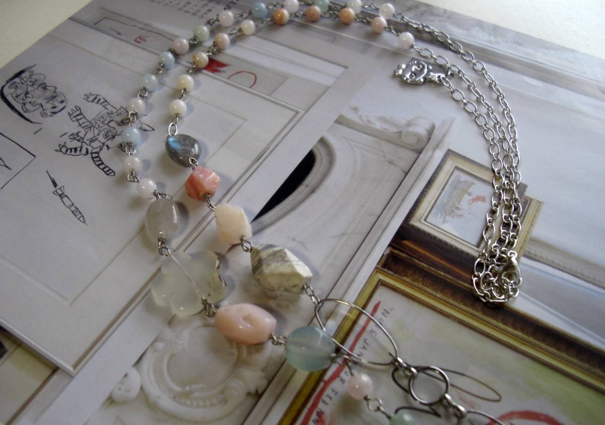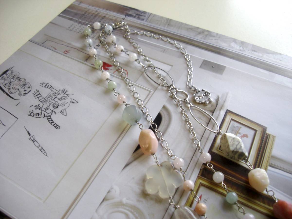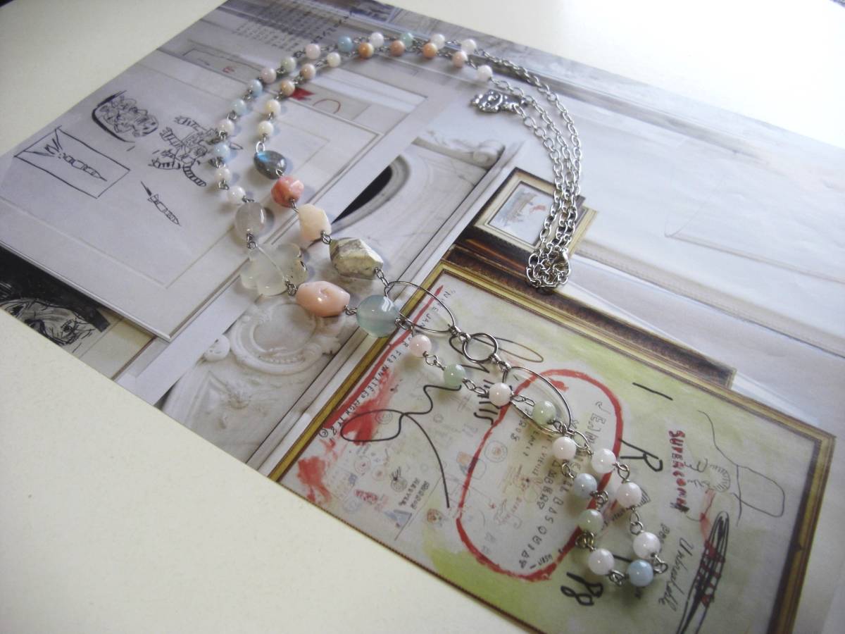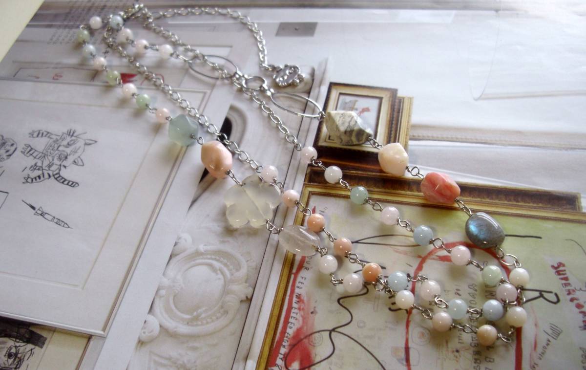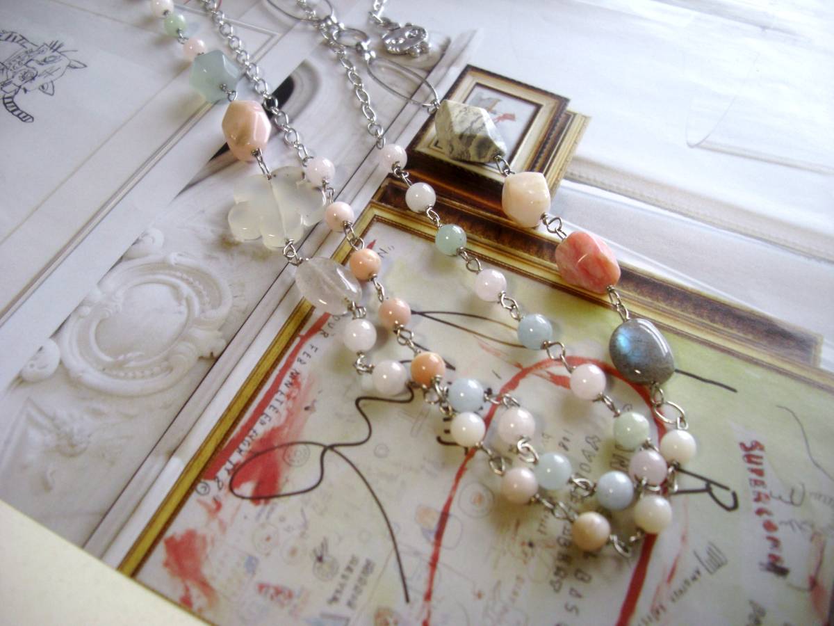 着ける幸せ・・シリーズです♪春の訪れ・・やさしいパステルカラーのベルリやピンクオパールのキュートなネックレスです♪6ミリの丸玉のベルリやピンクオパールに12ミリから18ミリ位までのラフカットやオーバルのインカローズやデントライトアゲートやラブラドライト、20ミリ位のお花のモスアゲート、デザインチェーンを合わせてロマンチックな表情です♪長さは全長115センチ位で調 節自由です♪そのまま長くされても2連にされても素敵です♪♪お揃いのブレスレットやピアスも出品しています♪シンプルで飽きのこないいつまでも着けられ るデザインを考えて作りました!ハンドメイドをご理解頂いてノークレーム、ノーリターンでお願いします
