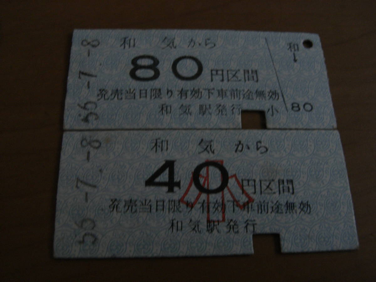 2枚/片上鉄道 和気から80円区間/和気から小40円区間 昭和56年7月8日 和気駅発行 2枚 ●日付5678並び