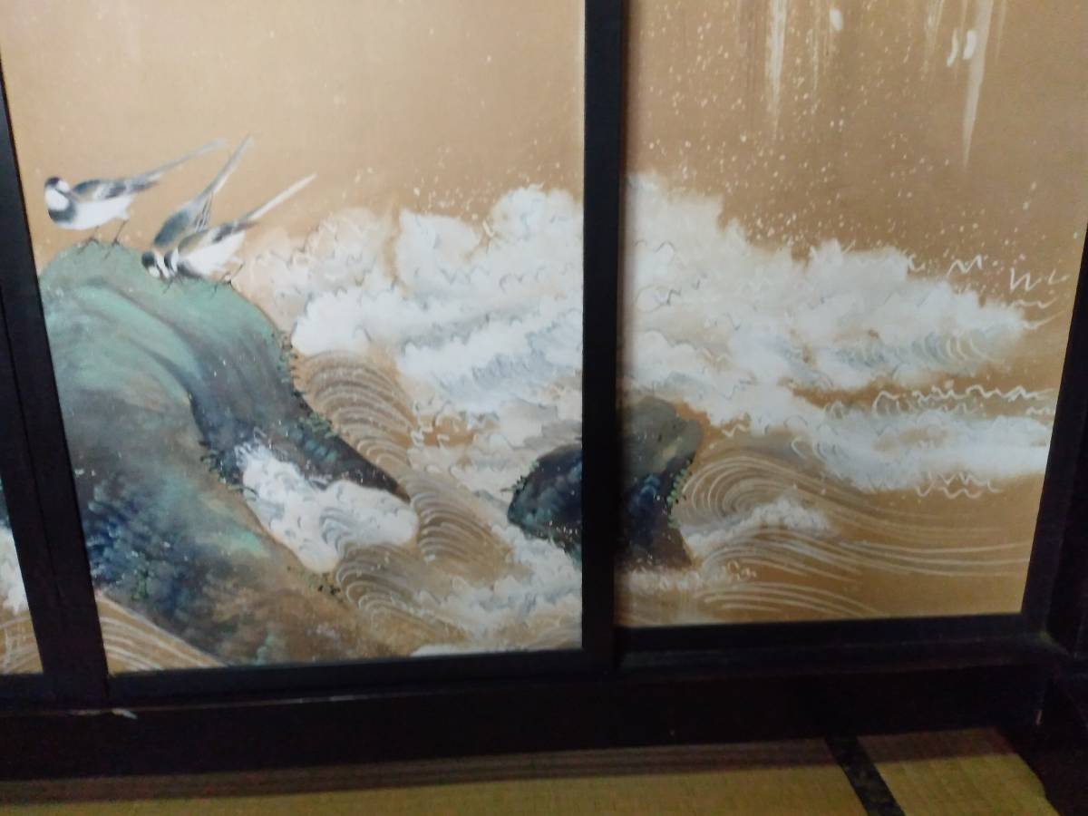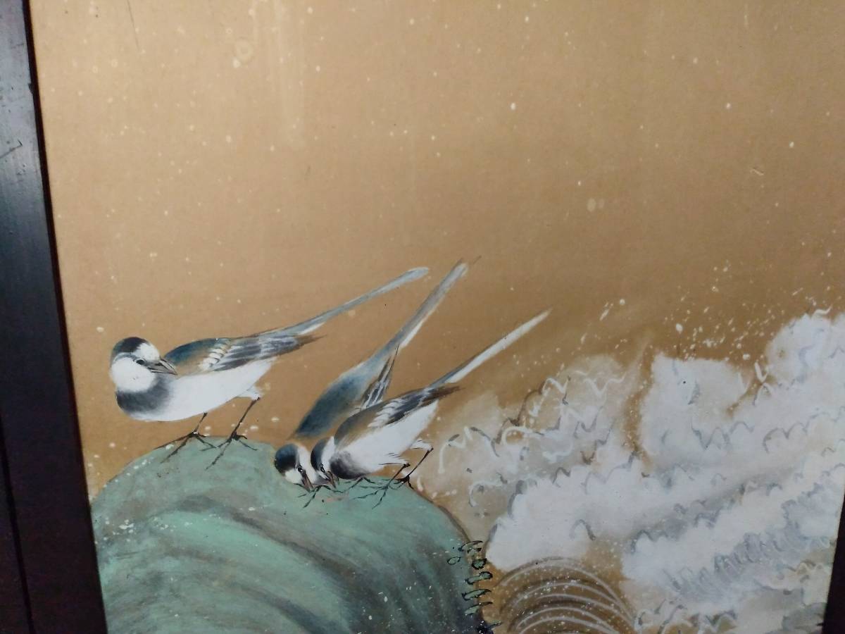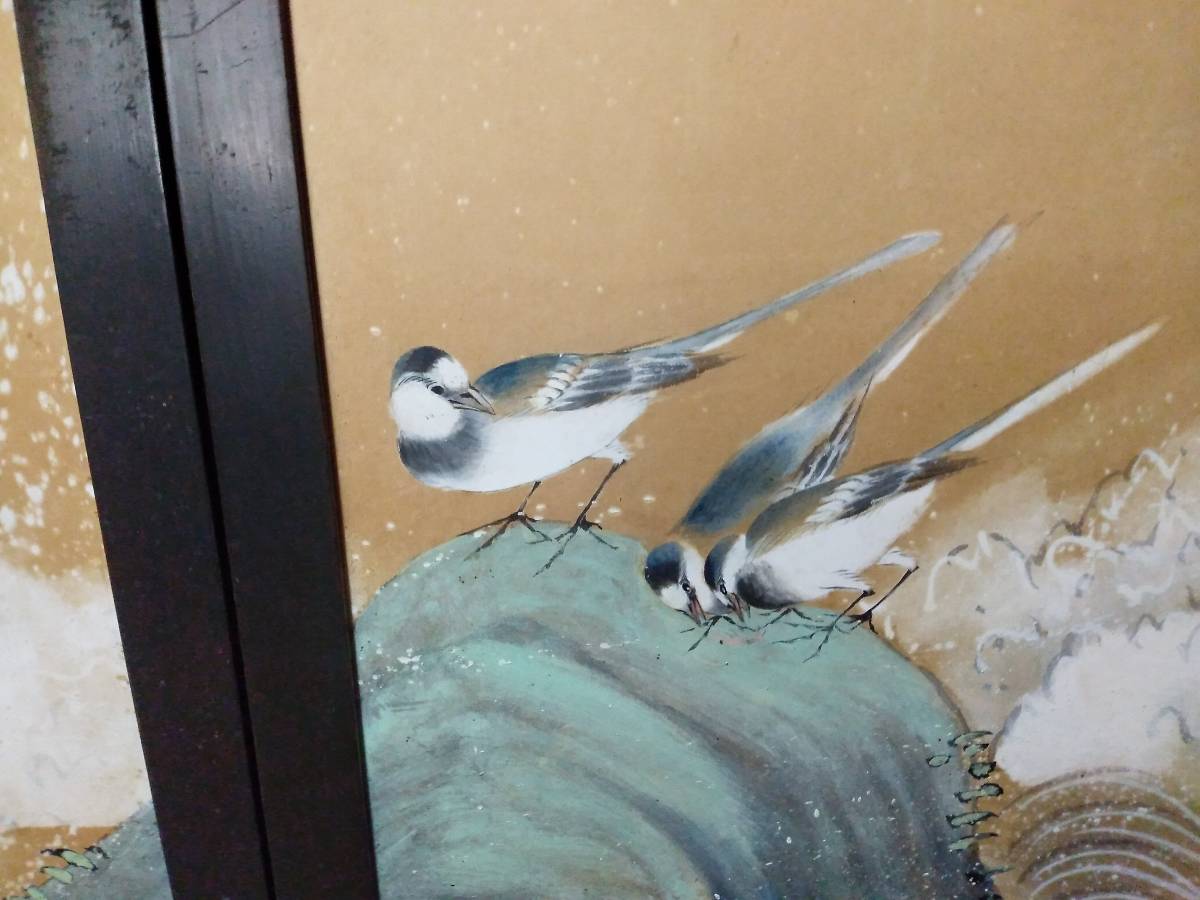 大型で大変立派な衝立です。紙本に肉筆、香洲筆の鳥図です。襖のような扉になっていて開け閉めできます。古い物になりますので、シミ、枠のすれ傷等ございます。ご理解の上でお願いします。サイズは