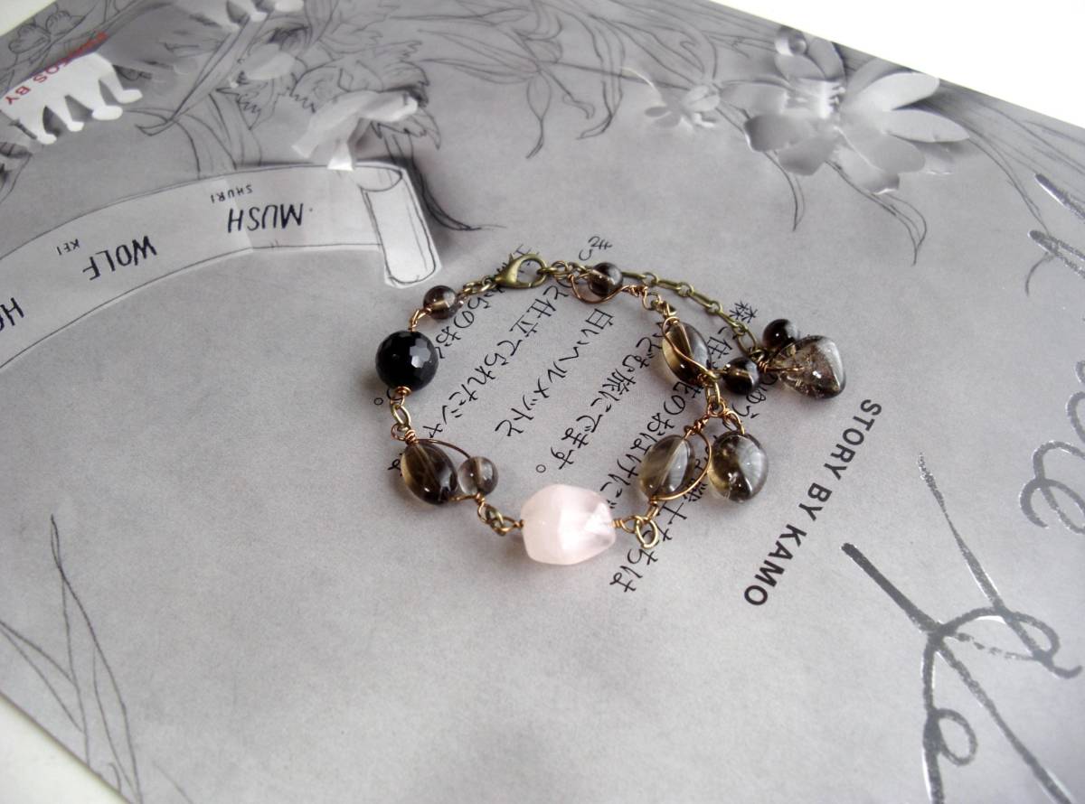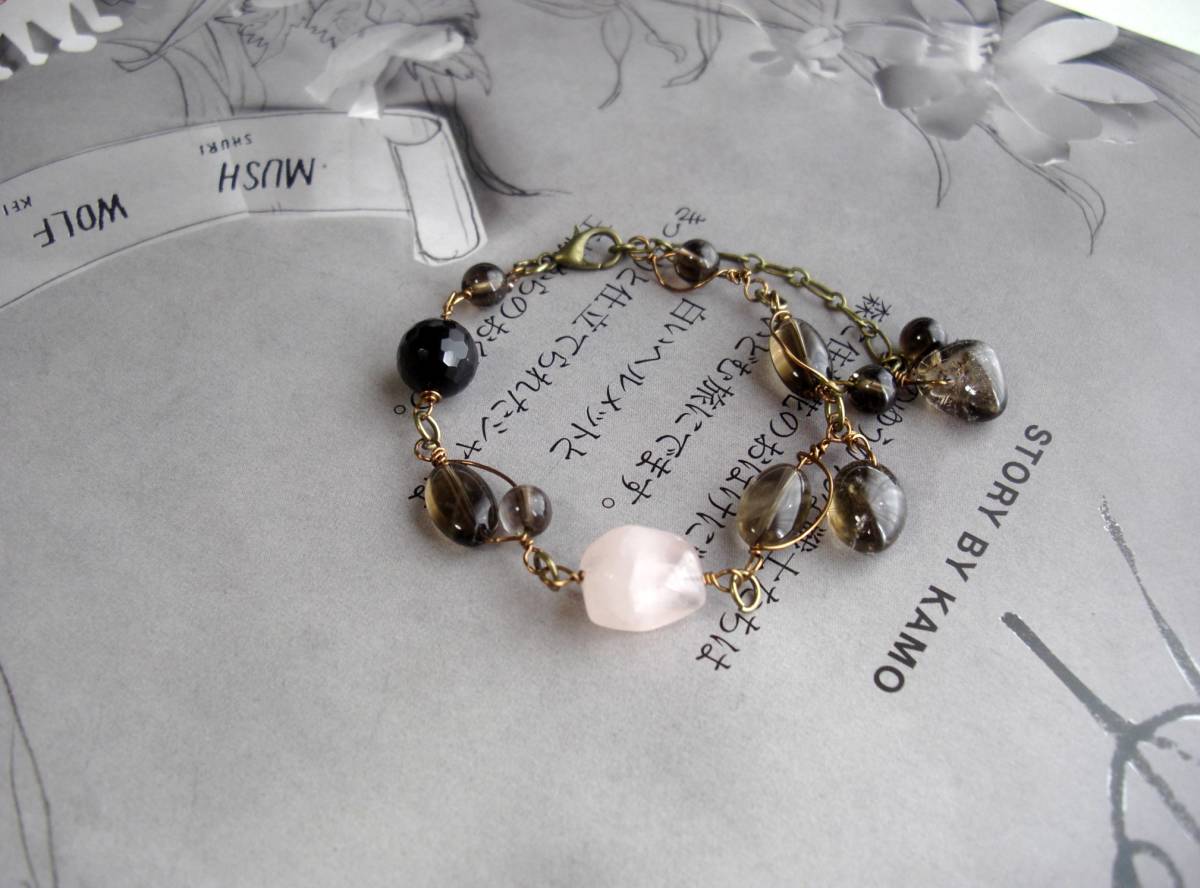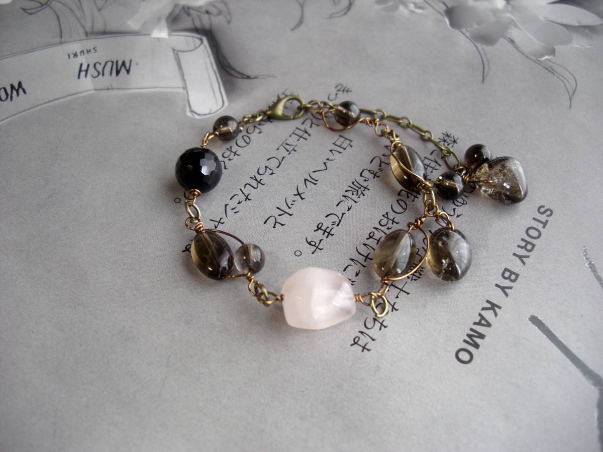 イーニドのコレクション・・シリーズです♪ロマンチックを紡いで・・繊細なクォーツを集めたブレスレットです♪6ミリから15ミリ位までの丸玉やオーバルやラフタンブルのスモーキークォーツに12ミリのオニキス、15×10ミリ位のラフカットのローズクォーツをワイヤーで繋いで大人のロ マンチックしています♪長さは全長23センチ位で調節自由です♪お揃いのネックレスやピアスも出品しています♪シンプルで飽きのこないいつまでも着けられるデザインを考えて作りました!ハンドメイドをご理解頂 いてノー クレーム、ノーリターンでお願いします