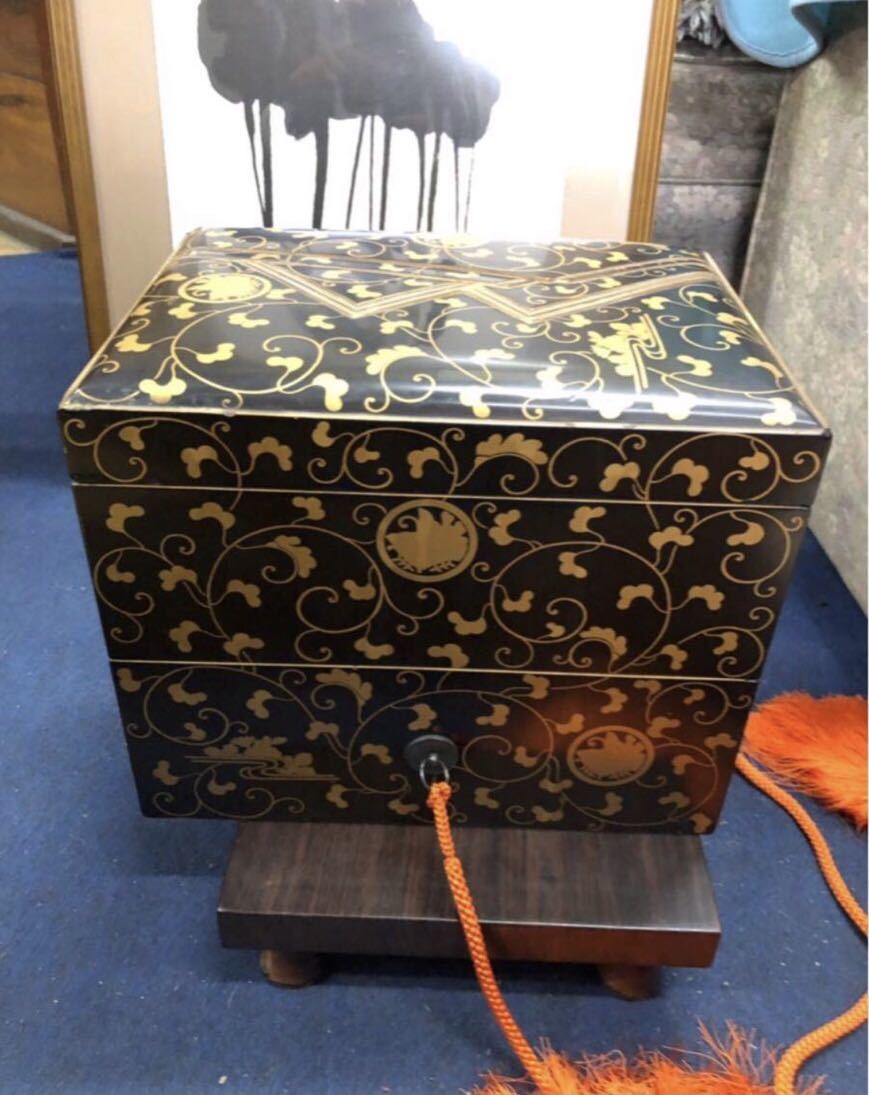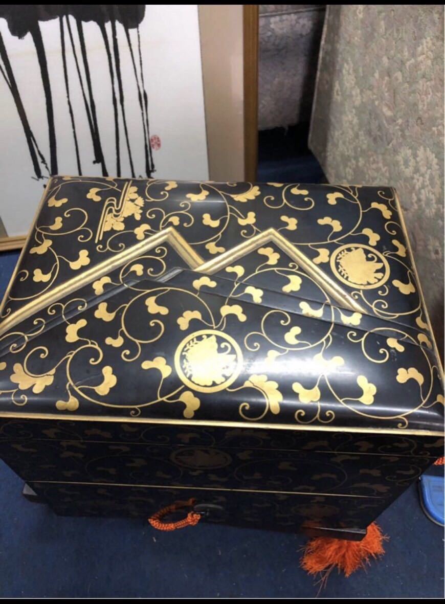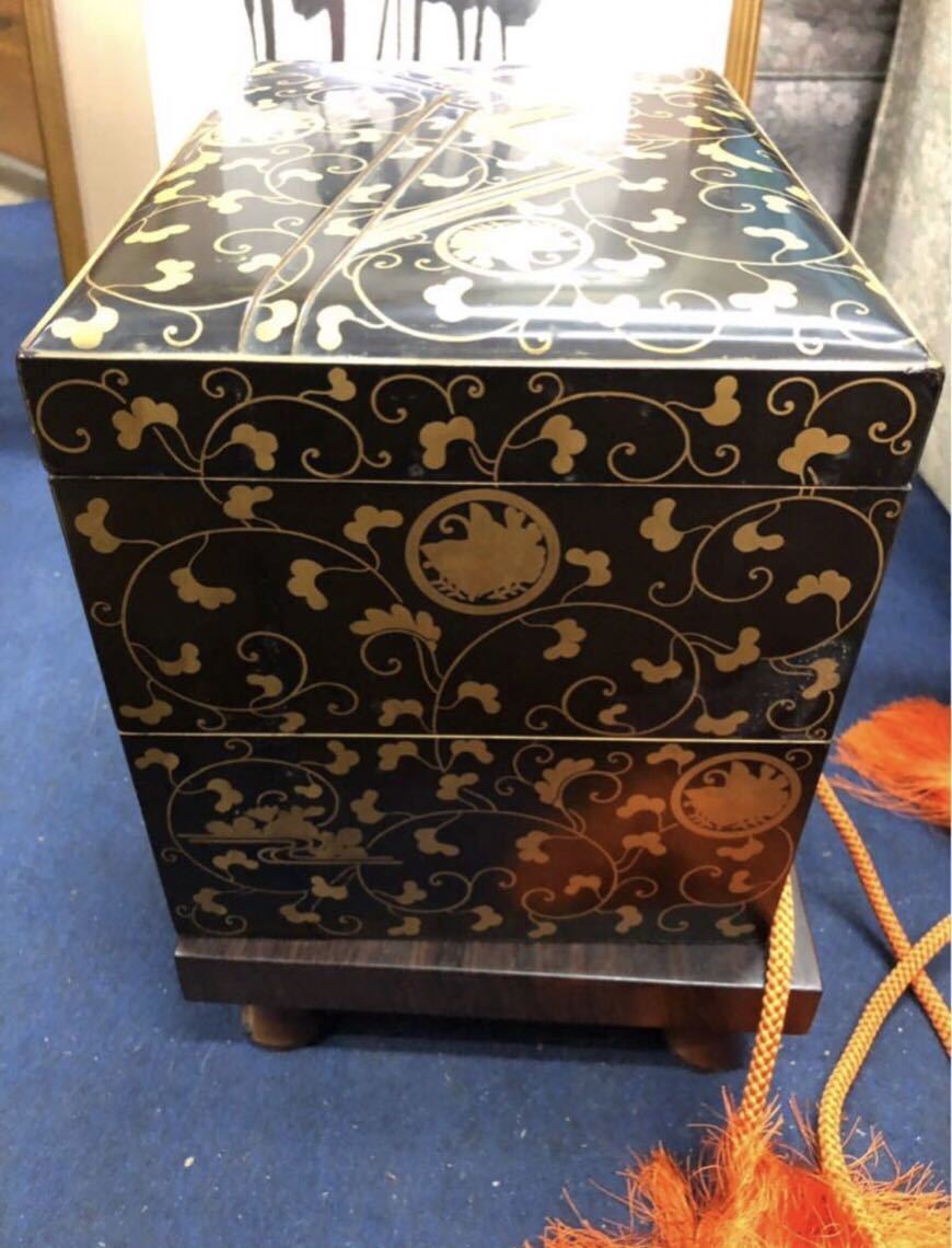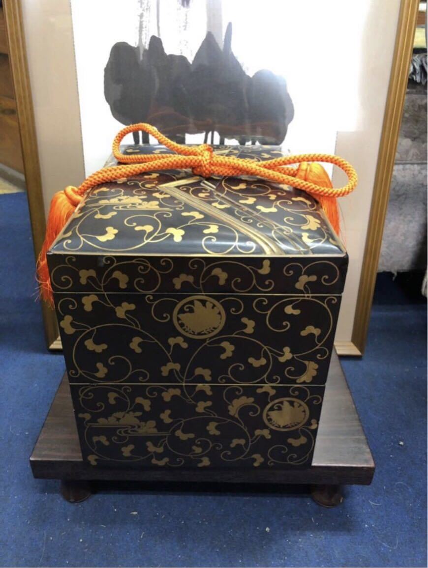 岡山藩 池田家 伝来 唐草 総蒔絵 江戸期 重箱 大名品 献上手 揚羽蝶 家紋 23.5cm×21.5cm×28.5cm 金蒔絵 漆 木工芸 銀金具 家紋入